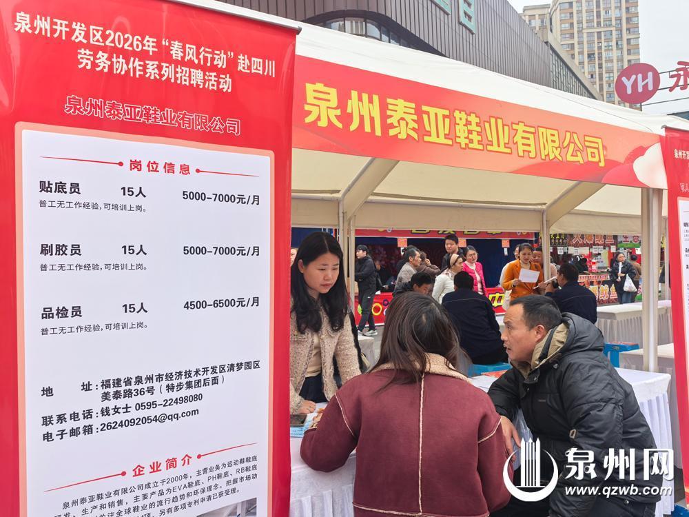 泉州网3月6日讯(融媒体记者 高慧子 文/图)继春节前赴江西等地开展劳务协作后,泉州开发区抢抓春季用工黄金窗口期,于3月1日至4日,组织10余家重点企业跨越千里,深入四川省达州河市镇、广安武胜县,将专场招聘会办在乡镇街头,把优质岗位精准送到群众家门口。泉州开发区产业根基扎实,用工需求旺盛,长期以来都是达州、广安等地务工人员的重要就业目的地。此次跨省送岗,既是两地深厚情谊的延续,更是搭建长效协作平台、为区域协同发展注入新动能的关键举措。