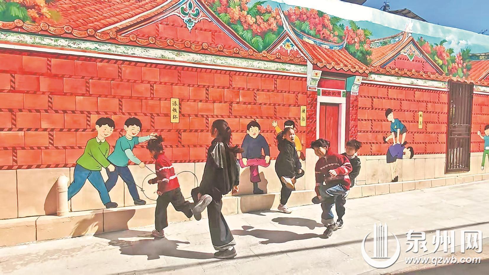 走进金埭村,村道旁以闽南红砖古厝为底色的童趣墙,复刻了儿时的游戏场景:滚铁环、跳马、跳格子、撞拐……鲜活灵动的画面,不仅勾起村民们的童年回忆,也让放学的孩童们蹦跳着路过,成群结队停下脚步,模仿起游戏动作。“跳格子我也会,我们一起玩!”孩童们欢呼着,小小的身影与画中孩童相映成趣。