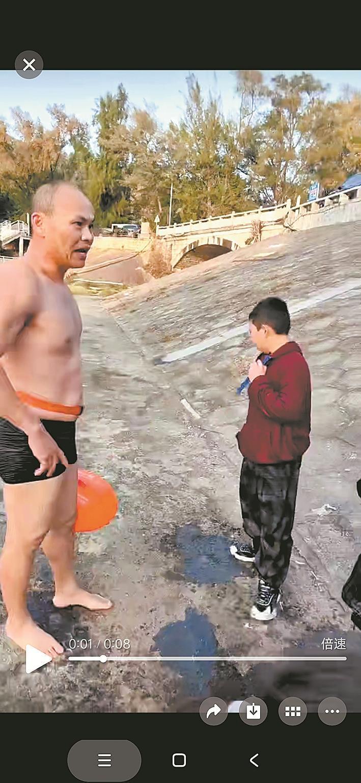 来不及细想,陈原子迅速朝呼救声方向狂奔而去。靠近后他看到,一米多深的水里,一名小男孩正在水中挣扎。他立刻跳进水中,一把将孩子拖住,半游半走地往岸边靠。由于水中的斜坡湿滑难行,岸边赶来的另一名冬泳协会会员陈波阳伸手拉住陈原子,正在水中游泳的冬泳协会会长刘惠雄也游过来帮忙。在众人的协助下,落水小男孩被顺利救回岸上。