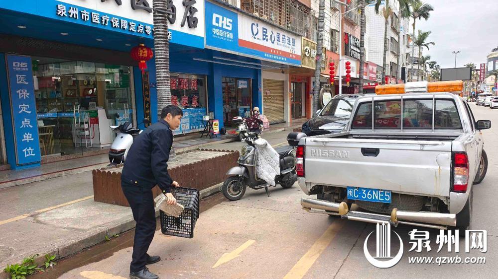 执法人员清理占车位的塑料筐