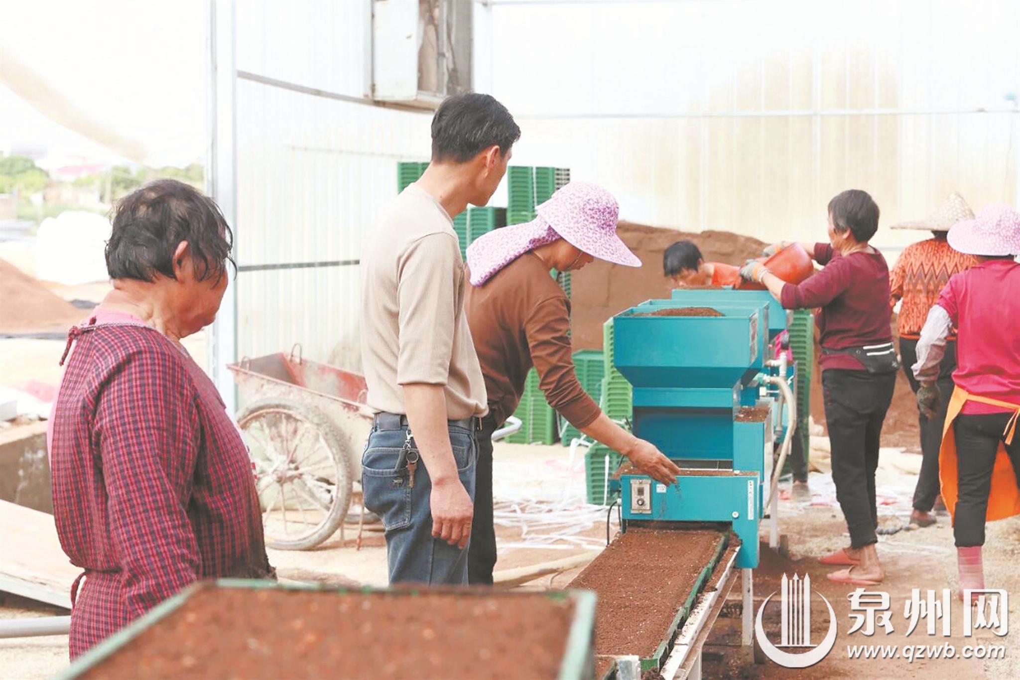 近日,记者来到位于南安水头镇朴二村的南安市农事综合服务中心,一条近3米长的自动化育秧流水线映入眼帘:工作人员将铺有专用无纺布的育秧盘放上输送带,机器便自动完成基质装填、营养液喷淋、稻种精播、覆土压实等全流程工序,标准化育秧盘快速成型,随即被送入暗室集中催芽。“盘底下铺无纺布是这两年采用的新方法。”南安市顺和家庭农场负责人吕锦全说,无纺布能够起到增强保湿的效果,有助于提高种子的发芽率和育秧效果,能够让秧苗根须更加发达,不容易断。