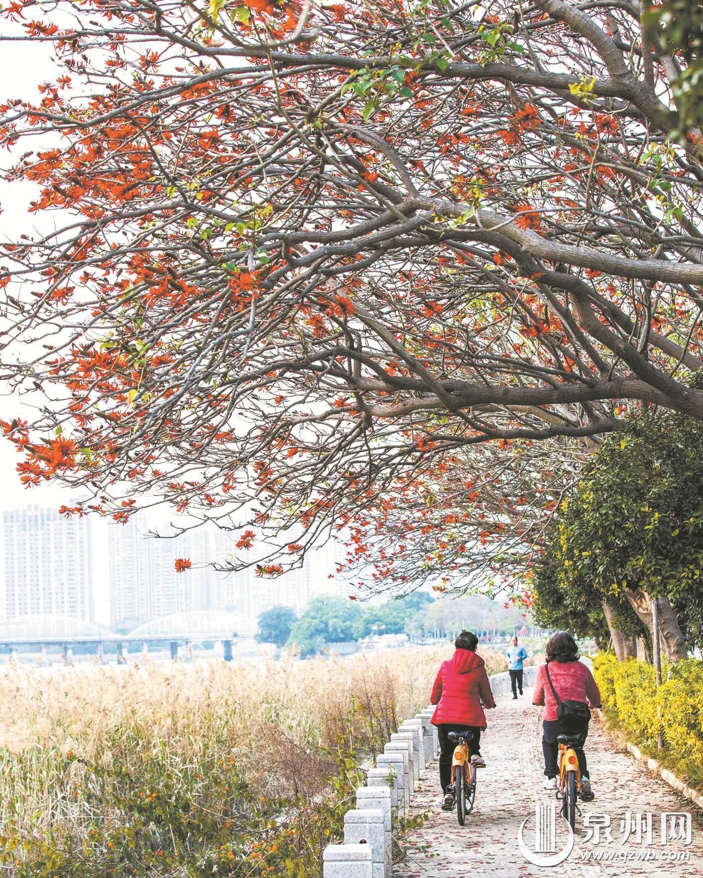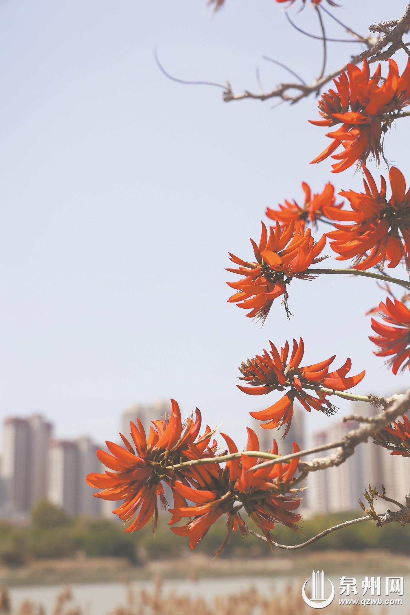 昨日上午,记者在市区北滨江公园笋浯园至石笋园看到,近百棵刺桐树正沿江盛放,一簇簇火红的刺桐花密密匝匝地缀满枝头。在阳光照耀下,刺桐花的红色更加鲜艳夺目,如燃烧的火焰,红彤彤一片,灿若云霞,成为晋江母亲河边的亮丽风景。