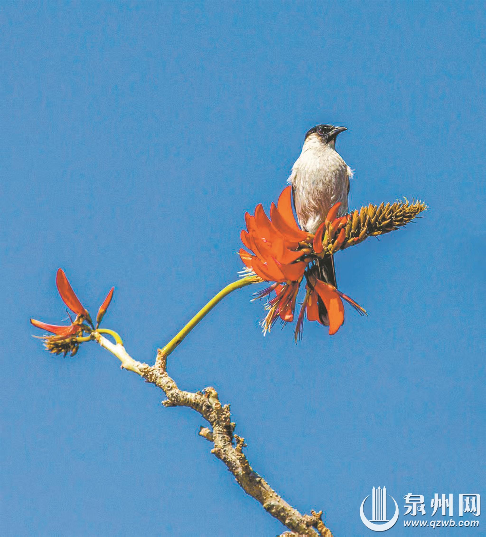 在中国闽台缘博物馆广场前,两排刺桐树高大挺拔,整齐排列。抬头望去,鲜红灿烂的刺桐花像春雨浇不灭的火苗,一簇簇在枝头点燃,宛如停驻的红蝶,格外显眼,带来春天的温暖。