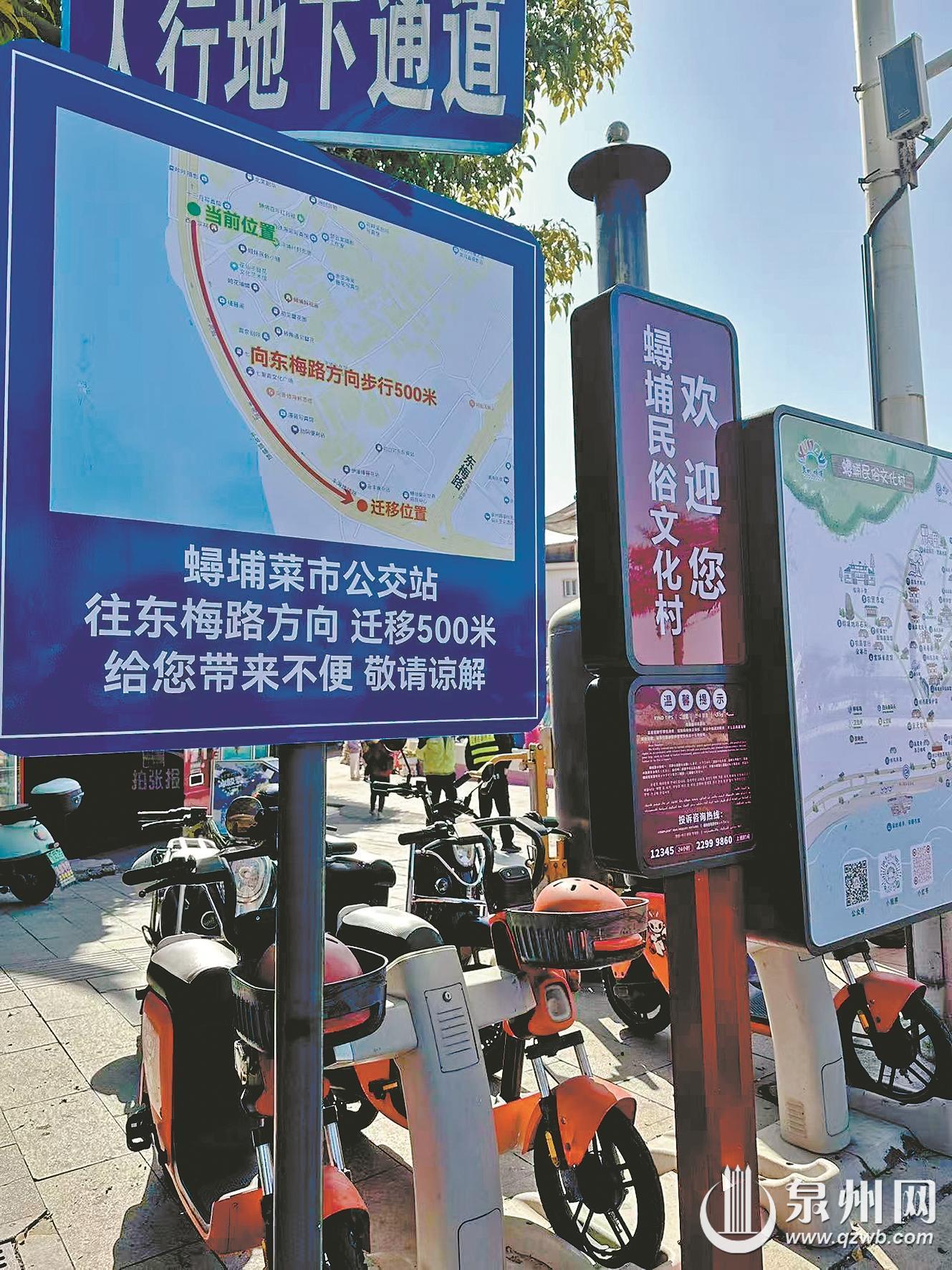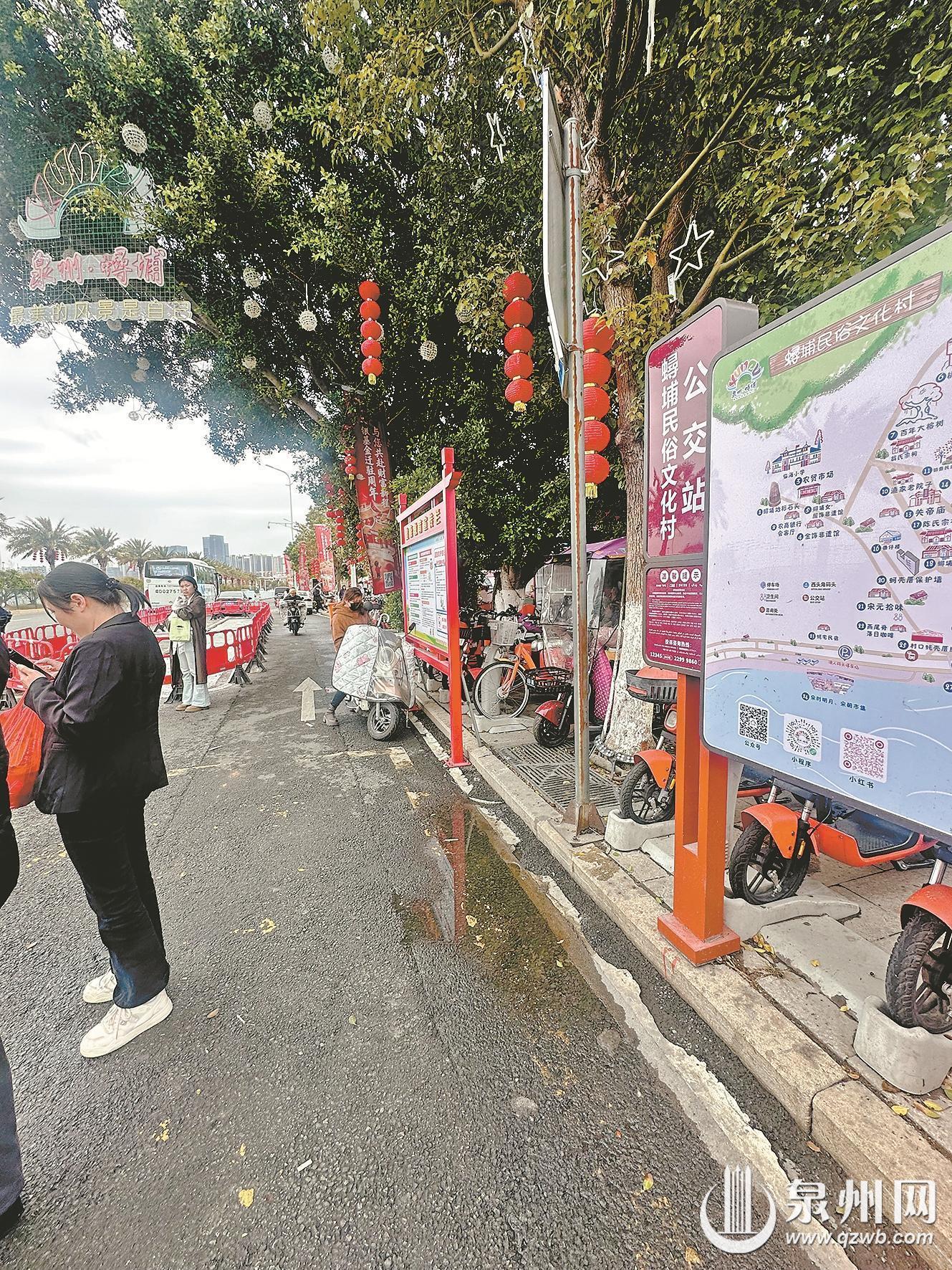 丰泽区蟳埔民俗文化村出入口立有一块标注“公交站”的指示牌,却没有公交车在此处停靠,容易对不明情况的游客造成误导。上周四,本报对此事进行报道,并将情况反映给泉州丰泽浔埔商业管理有限公司处理。昨日,记者在现场回访时看到,原本写着“蟳埔民俗文化村公交站”指示牌已变更为“蟳埔民俗文化村欢迎您”,并在旁增设一块新指引牌,明确标注“蟳埔菜市”公交站迁移后的公交站方位。(融媒体记者刘燕婷 文/图)