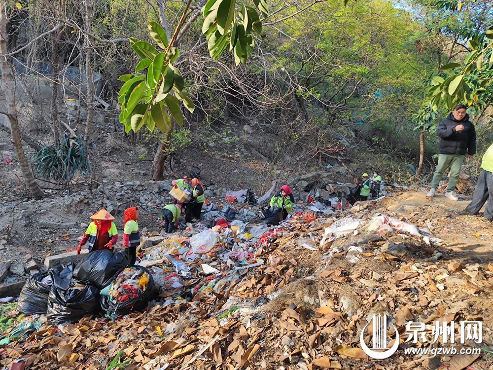 当日下午,记者回访鸡笼山路侧的垃圾堆现场,发现丰泽城市运营公司组织的近20名保洁人员正齐心协力,站在排水沟一线,逐一将垃圾装进塑料袋,移到人行道绿化带处,由一辆小型推土机铲到货车上。“我们从下午2时就过来了,到现在已清理了3个多小时,预计全部清理完,得有近20吨垃圾。”现场负责人小杨说。多位保洁人员告诉记者,此处卫生死角他们已小规模清理四五次,这是第一次彻底大清理。他们呼吁相关部门加强管理,杜绝违规倾倒垃圾。
