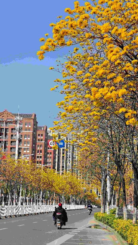 晋江文创路两旁的黄花风铃木,将春日的浪漫铺成一条金色长廊。