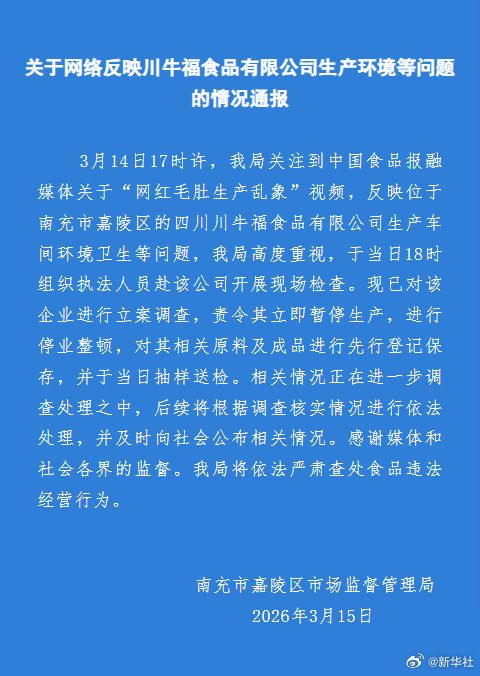 3月15日,四川南充市嘉陵区市场监督管理局针对关于“网红毛肚生产乱象”视频发布情况通报:已对川牛福食品有限公司进行立案调查,责令其立即暂停生产,进行停业整顿,对其相关原料及成品进行先行登记保存,并于当日抽样送检。