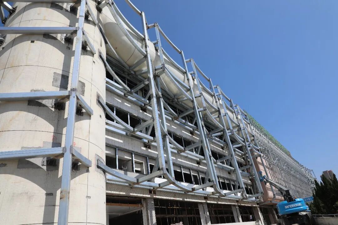“目前已基本完成内部加固、外墙钢结构工程,正在进行幕墙骨架搭建、门窗安装等工序。”项目施工方负责人表示,主馆建筑外立面面积约8800平方米,外立面改造预计于今年5月中旬完工。当前,项目还同步进行室外道路及地面铺装工程,后续将加速推进园林绿化、夜景工程等。