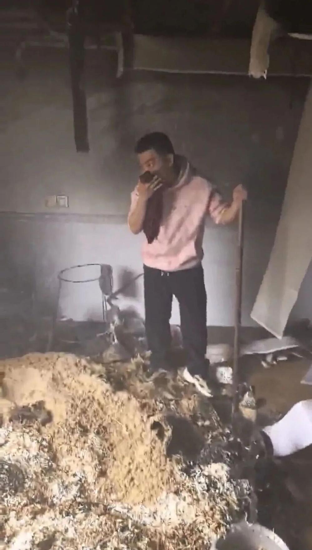 灭火后,吴垚坚用铁锹仔细翻检灰烬。(视频截图)