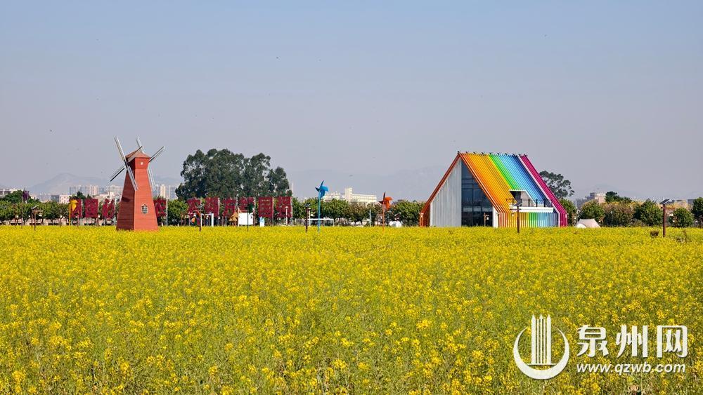 在南安水头镇五里大盈溪·稻梦岛,连片金黄随风舒展,风过处花浪轻摇,清甜花香扑面而来。红风车轻转,彩色小屋点缀其间,为春日添上几分烂漫童趣。游人漫步花田,将满眼春光一一收入镜头。