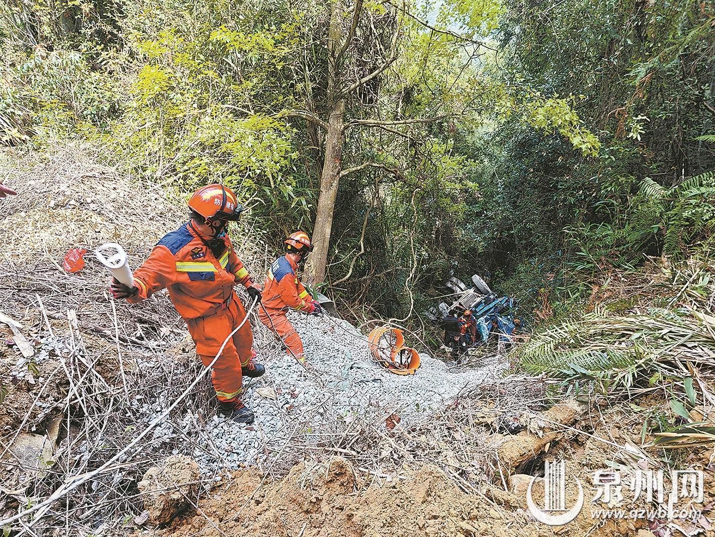 事发村道路面仅3米多宽,大型救援车辆无法通行。事发地位于道路转弯处,土方车严重变形,蓝色车厢与底盘分离,车轮朝天倒扣在茂密的竹林与灌木丛中,土石散落一地。德化消防救援人员接警后,立即携带救援器材,在当地村民的带领下徒步赶往事故现场。