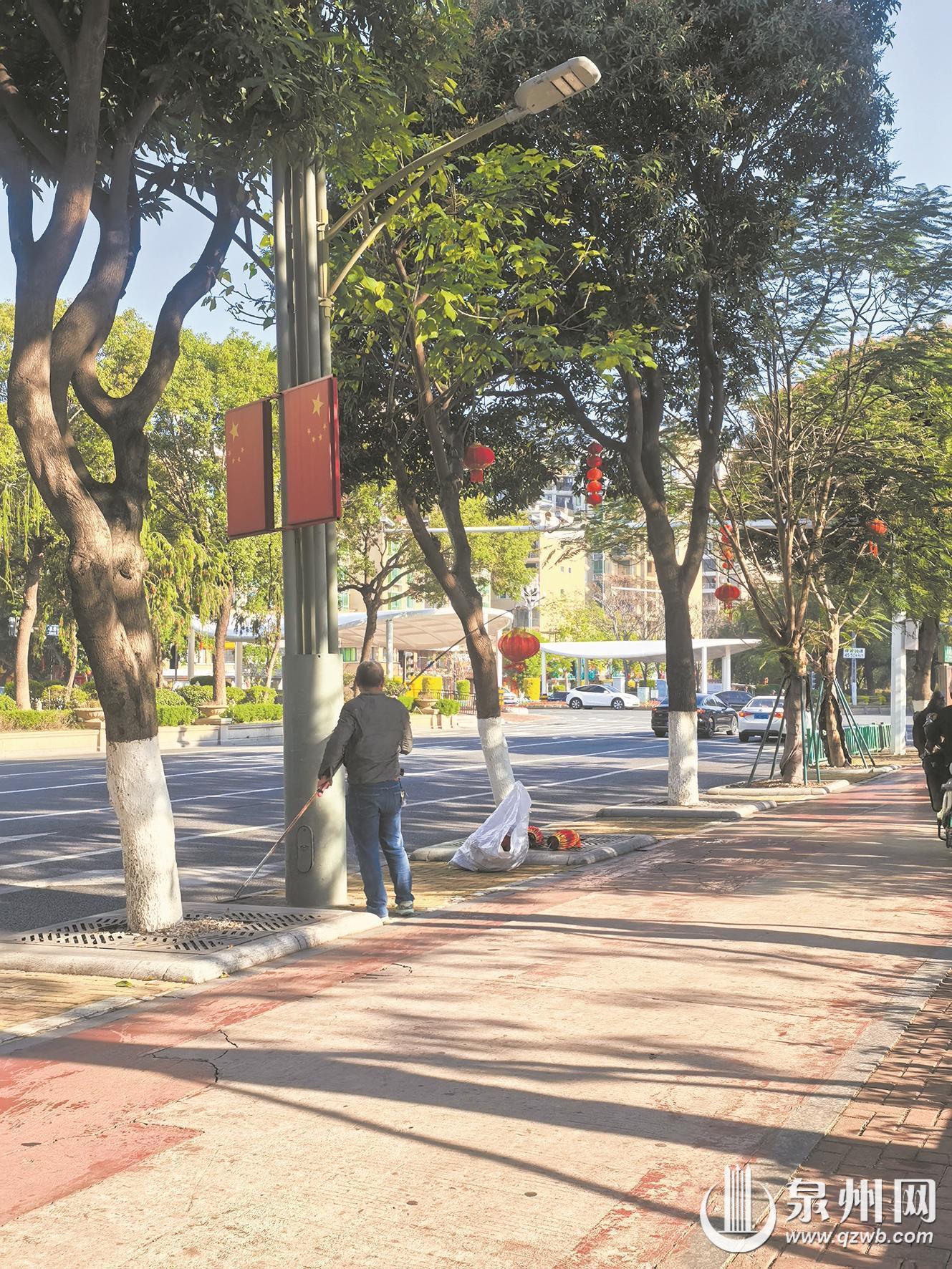 在泉州市区刺桐路、泉秀街、田安路路段,记者陆续看到有工作人员手持竹竿,小心翼翼地将树上的一个个红灯笼拿下来,并收纳到袋子里。