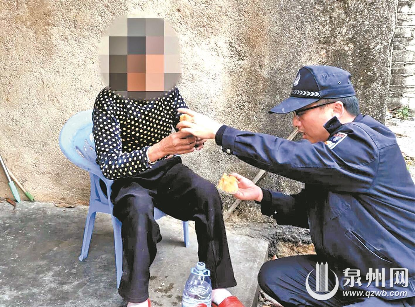 进入庭院后,民警上前查看阿婆的状况,确认她意识清醒,只是因为不慎摔倒而无力起身。民警将老人扶起,让她坐在椅子上,考虑到她长时间未进食,便拿来饮用水和面包让她先补充体力。