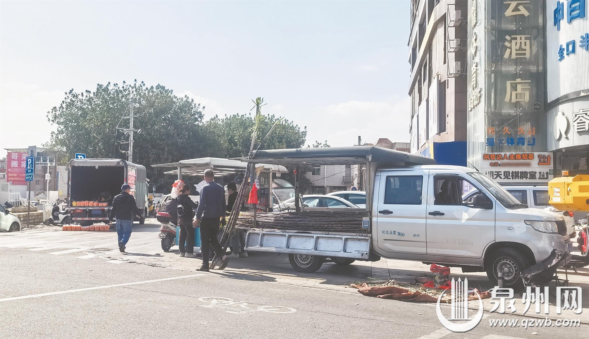 记者在现场看到,一辆满载甘蔗的小货车停在广场的出入口,摊主时而招呼顾客,时而帮顾客削皮,而甘蔗皮就直接放在铺设在地上的编织袋上;旁边的一辆电动三轮车则售卖着各类水果,摊主叫卖声不断。而在靠近泉州大桥一侧,一辆载着苹果的大货车停放在广场上,摊主打开货厢门,将成袋的苹果摆放在地上,供顾客挑选。恰逢广场上有一家店面正在装修,大型机械施工,现场显得更加拥挤、杂乱。