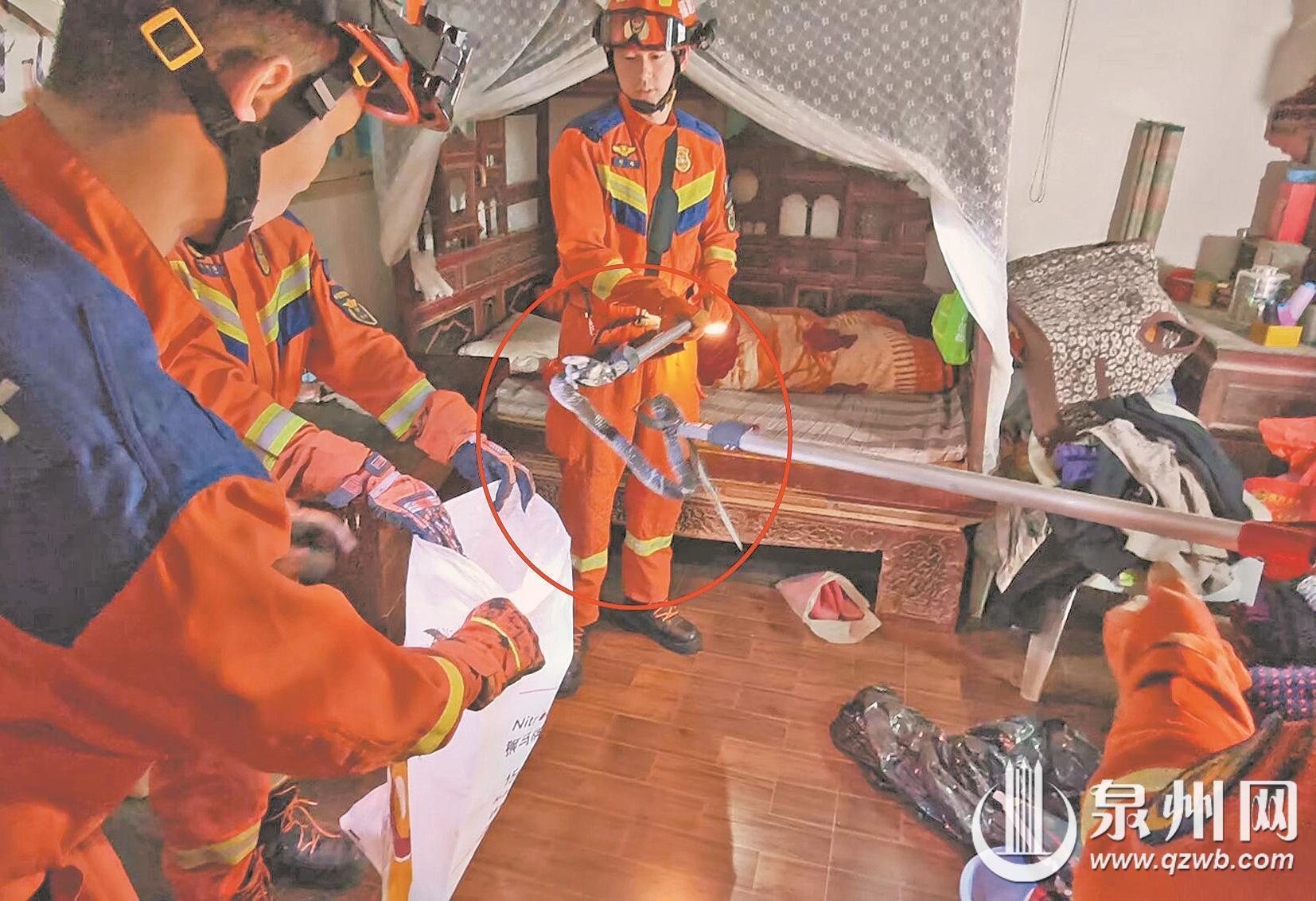 泉州网3月19日讯 (融媒体记者林志安 通讯员张伟斌 文/图)17日,在惠安县涂寨镇和弄村,一条眼镜蛇溜进民宅,老奶奶发现后将门反锁。当晚,消防救援人员接到求助后赶到现场将蛇抓获。