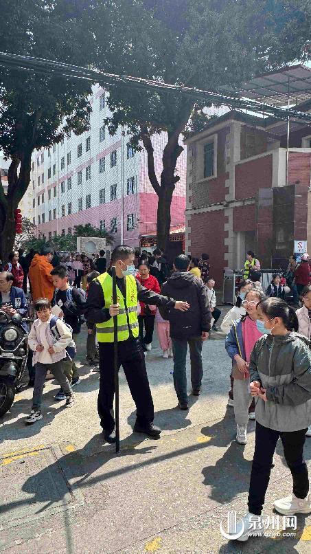 丰泽区实验小学家长志愿者与保安协作引导学生安全过斑马线