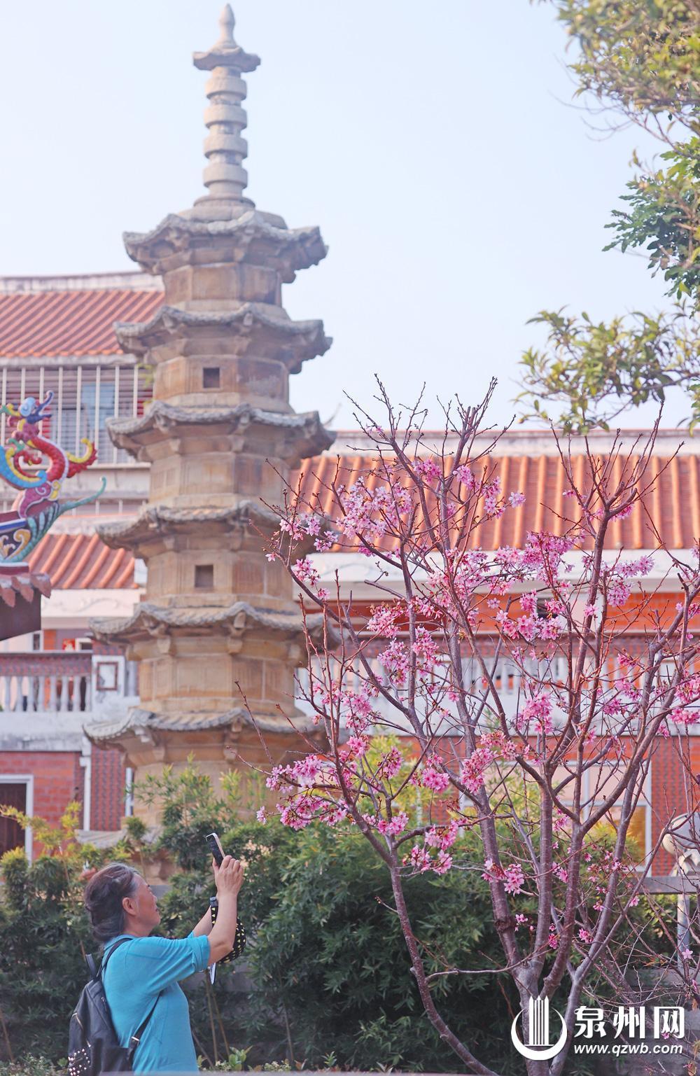 泉州崇福寺应庚塔下的樱花渐次开放,吸引不少市民前来打卡。(王柏峰/摄)