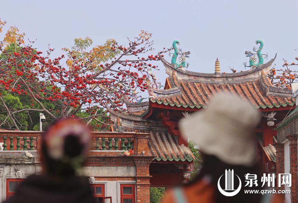 文庙泮宫口红砖厝旁,木棉花开正艳。(王柏峰/摄)