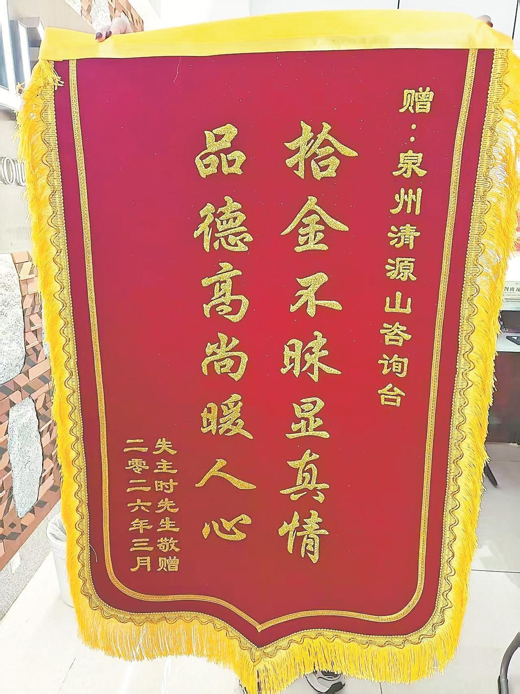 相比魁星岩的感人细节,清源山景区的日常失物寻回工作,则展现出另一种高效的团队协作之美。3月1日,游客时亮一家将一面鲜红的锦旗和一封真挚的感谢信送到了景区游客中心,锦旗上“拾金不昧显真情 品德高尚暖人心”几个大字,为几天前那场火速寻物接力写下圆满的注脚。