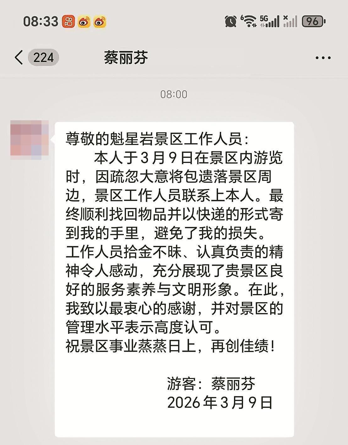 不久前,永春魁星岩景区收到了一封来自游客蔡丽芬女士的感谢信,信中对工作人员颜聪彬及整个景区的效率与诚信赞不绝口,称这份经历让她深深感受到了景区的服务素养与文明魅力。