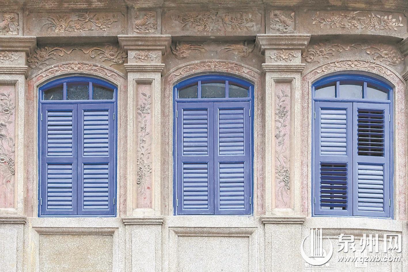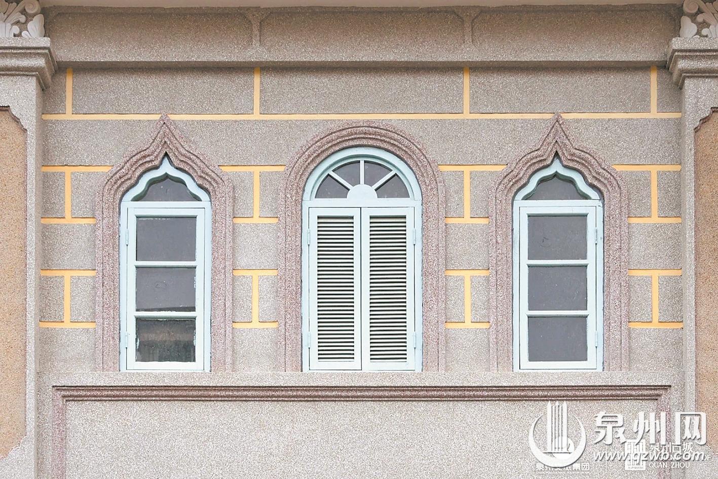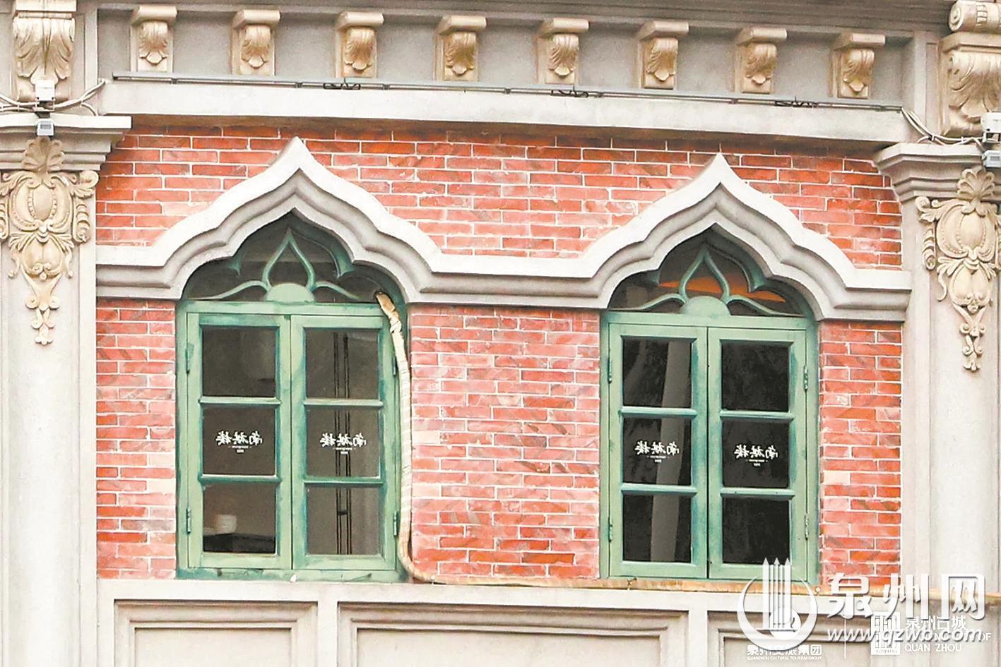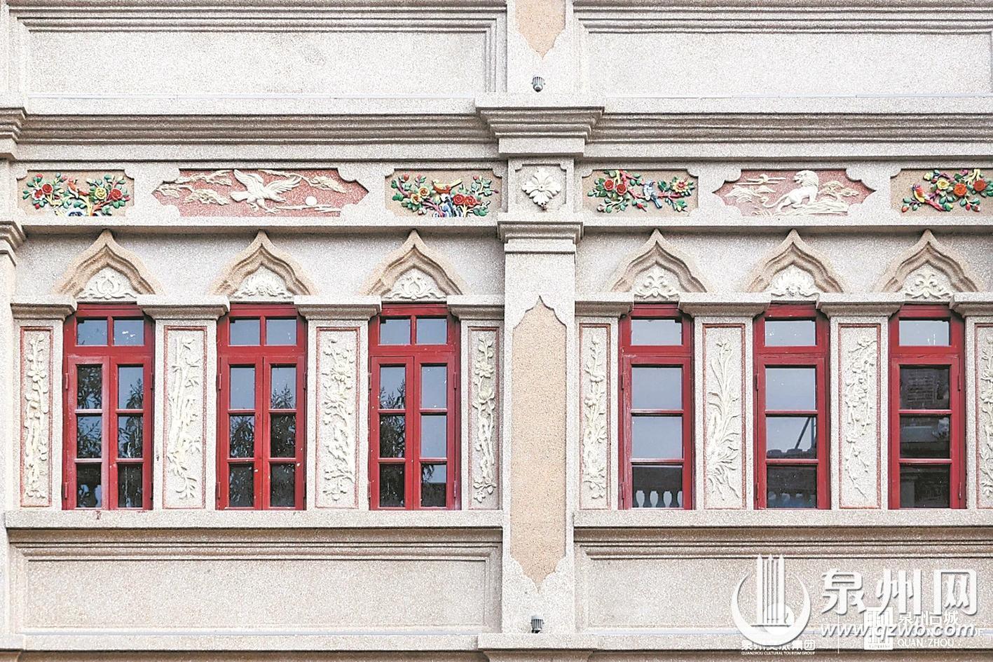 完整的骑楼窗套,自上而下分为窗楣、窗柱、窗台三部分。自洋楼窗式工艺传入泉州后,本地工匠取其精华、融会贯通,让骑楼窗形成了独树一帜的中西混搭风格。窗楣处常见伊斯兰样式的多层线脚,利落且富有层次,一旁还搭配着闽南世俗花鸟图案。窗台之下嵌入的特色花砖,与异域线条相映成趣,成为中山路独有的建筑表情。夹于窗间的临街货门更具烟火气,这一专为上下传货设计的特殊构造,成为骑楼商业街百年商贸的鲜活印记。