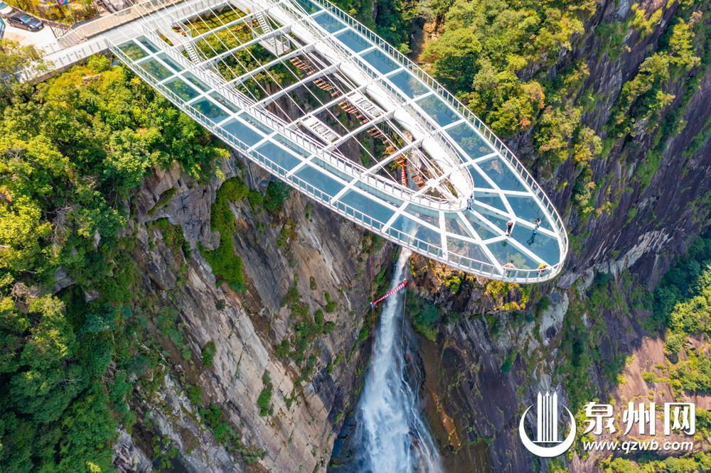 石牛山玻璃观景台与岱仙瀑布(泉州晚报资料图片)