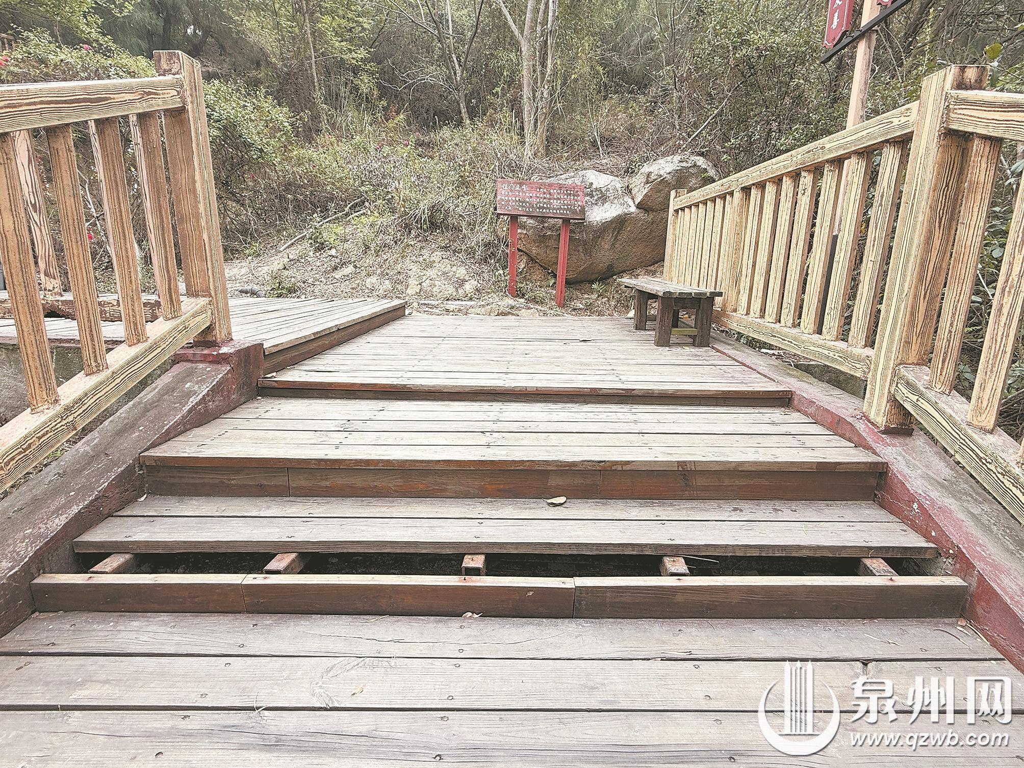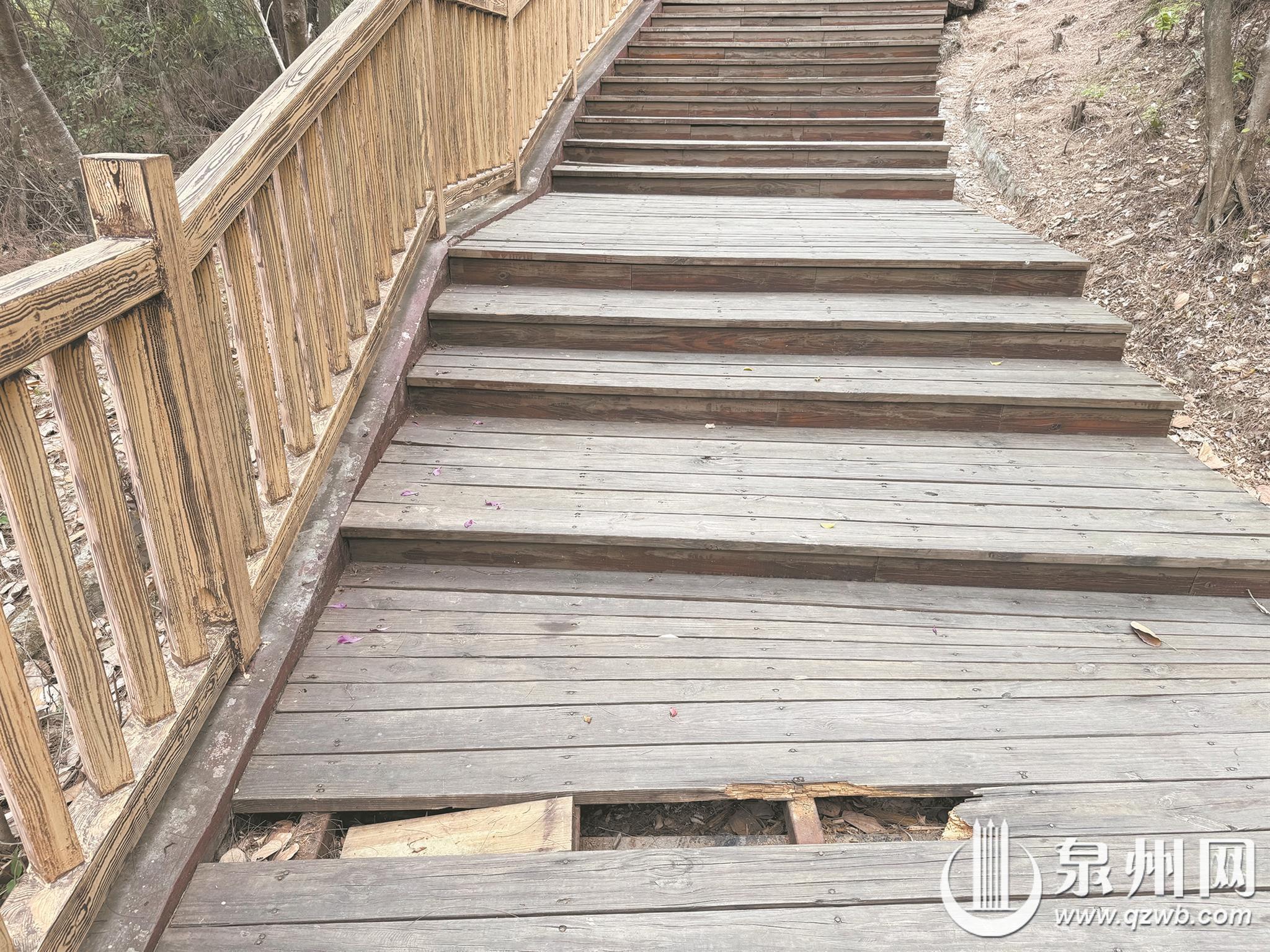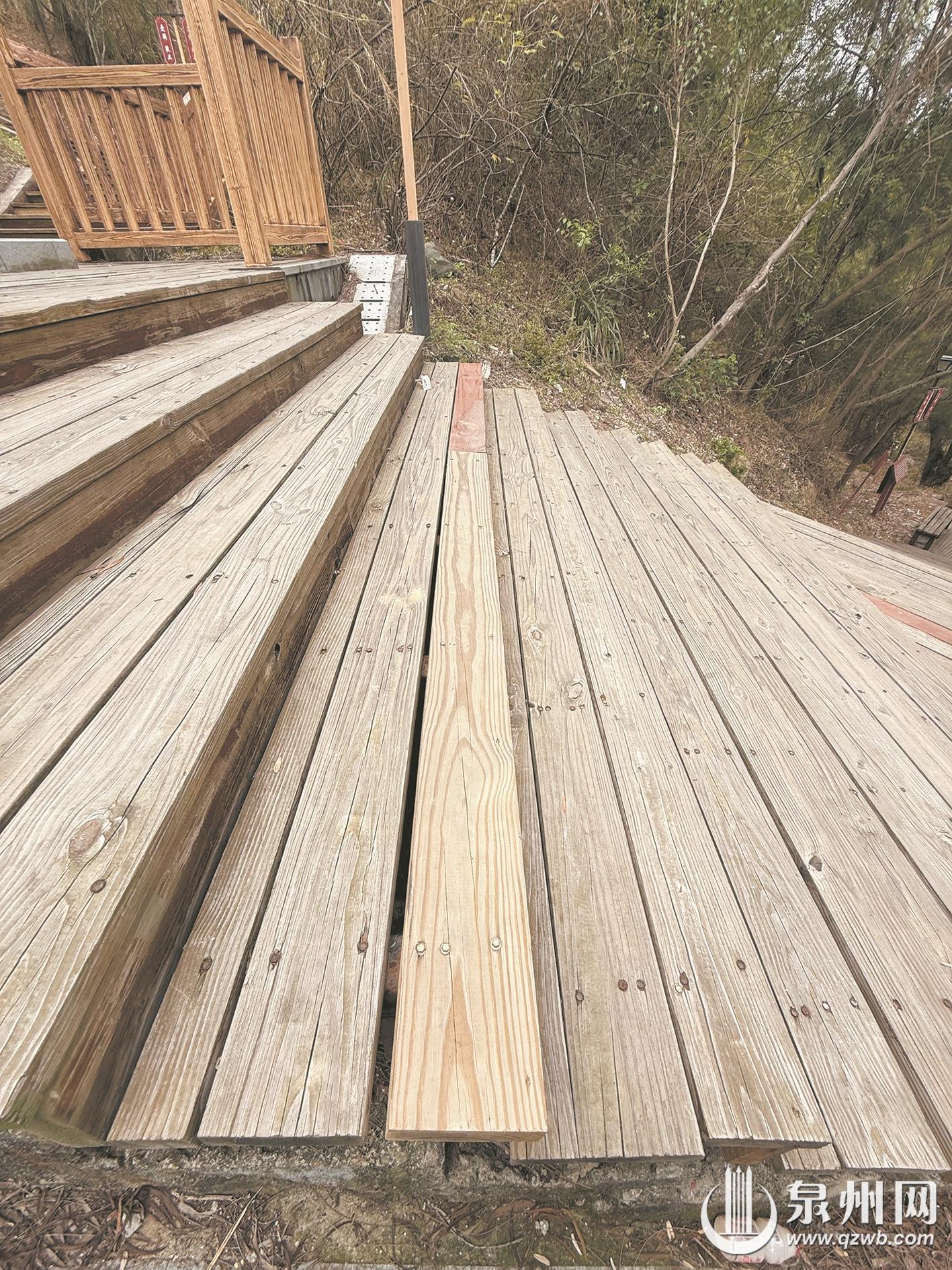 “桃花山公园木栈道去年刚修补过,现在又有其他地方的木板断裂、翘边,孩子走上去都摔跤了。”近日,有市民拨打泉州晚报社24小时热线96339反映。去年3月,泉州晚报曾报道市区桃花山公园木栈道破损问题,建设单位回应将对公园进行全面整修。然而,距离去年9月修复工程竣工仅半年,破损问题再次出现。市民期盼相关部门建立长效管养机制,消除安全隐患。