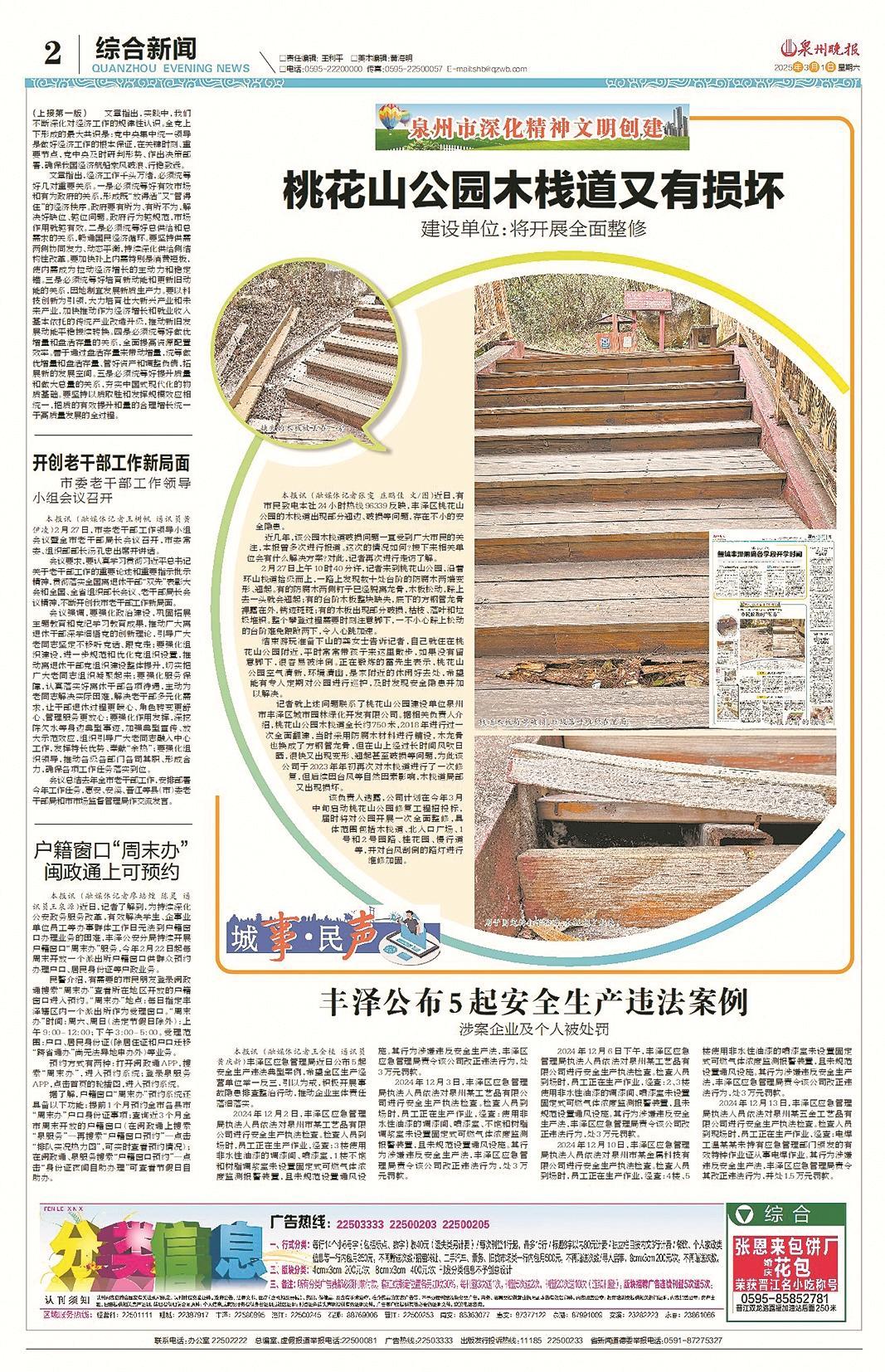 针对市民反映的问题,记者联系了泉州市丰泽区城市园林绿化开发有限公司。相关负责人介绍,公园木栈道去年9月完成维修,但木板材料在户外风吹日晒易损坏,导致局部变形、翘起甚至破损,需持续日常维护保障。“对于市民提到的破损问题,我们核实后将及时安排专业人员进场维修,消除安全隐患。”
