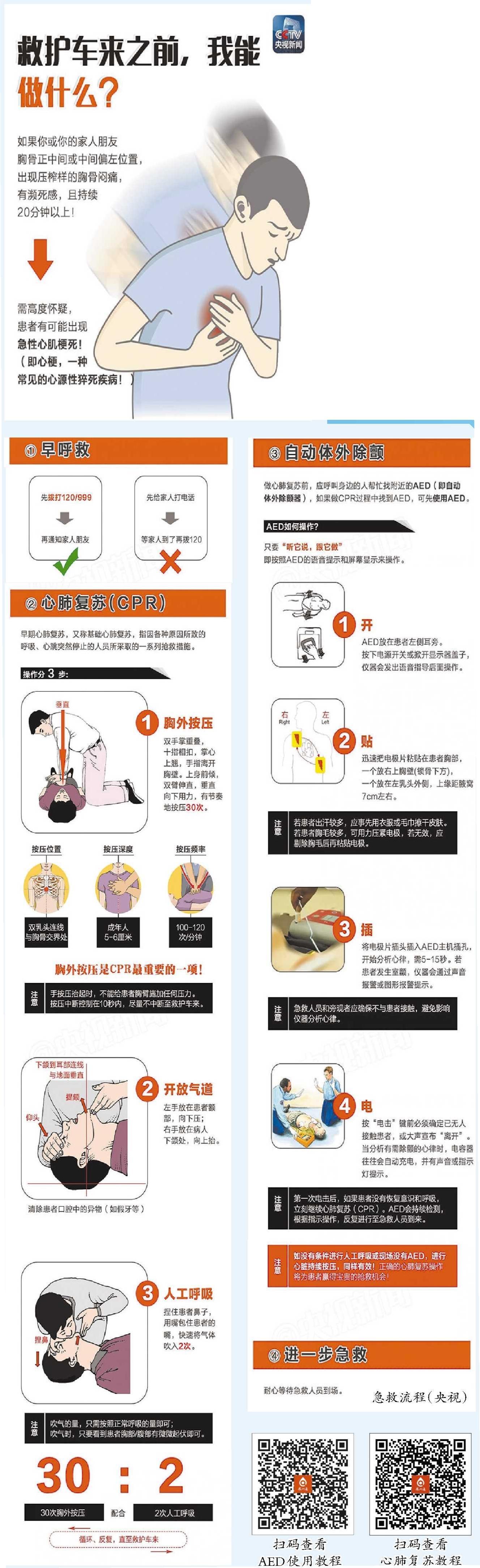 “心跳骤停发生后,抢救必须争分夺秒,把握好‘黄金四分钟’。”据介绍,心跳骤停后,大脑在内的所有组织器官缺血、缺氧超过4分钟会造成不可逆损伤,超过6分钟,生存率急速下降。人一旦倒下,就应立即开始胸外按压。如果现场配有自动体外除颤器(AED),也应尽快使用。即便现场没有AED,也不能等待,应第一时间进行徒手胸外按压,很多患者正是靠早期按压争取到了后续抢救机会。