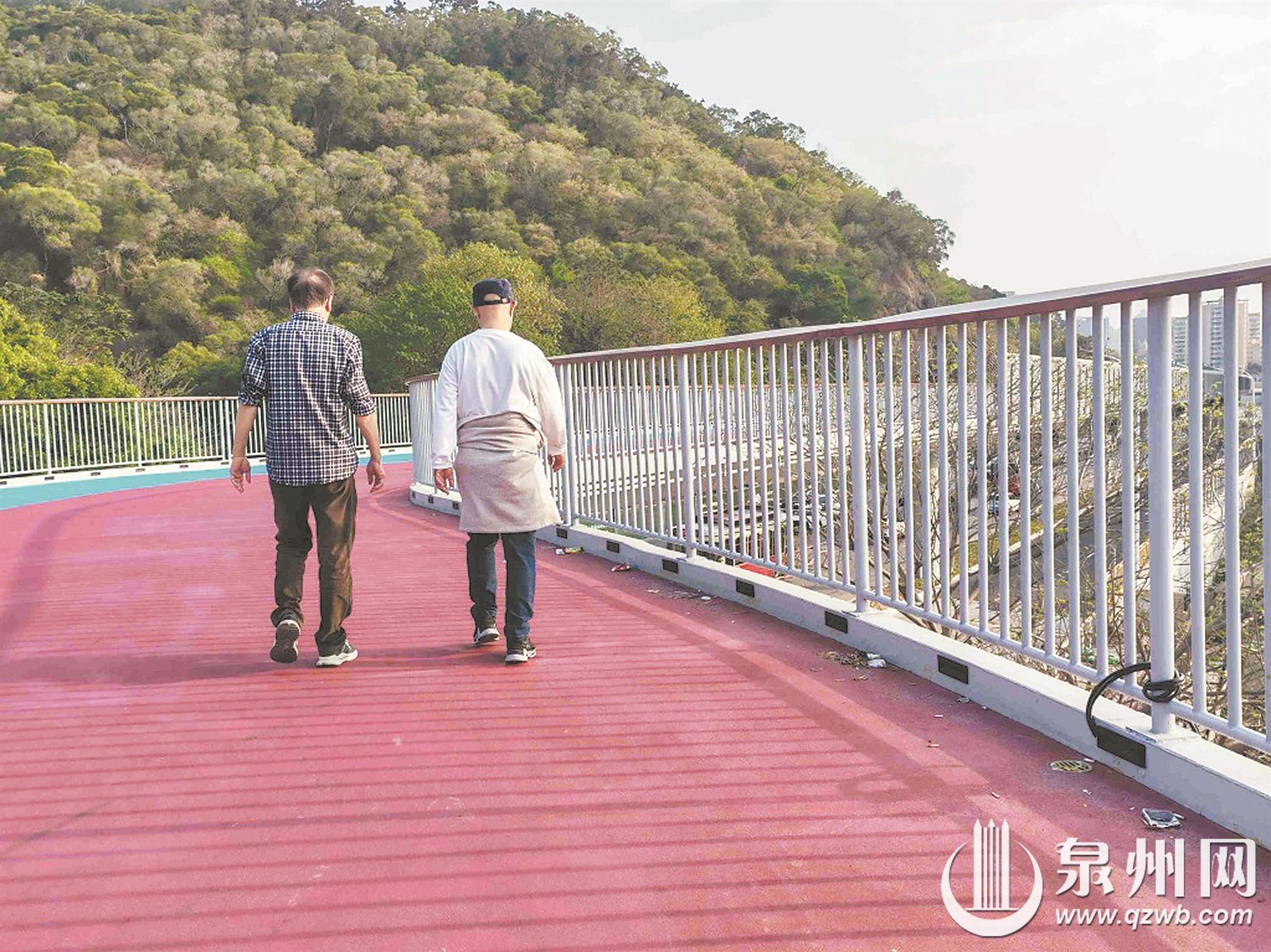 2月14日全面开放的坪山路北段慢行天桥,总长约1100米,串联起丰泽街、湖心街、郑成功公园等多个城市节点。桥面采用醒目的红蓝防滑铺装,明亮色彩与沿线绿化景观、现代楼宇相映成趣,成为市民闲暇时的“新晋打卡点”。桥上行人悠然漫步,非机动车顺畅通行,有效解决了人车混行难题。