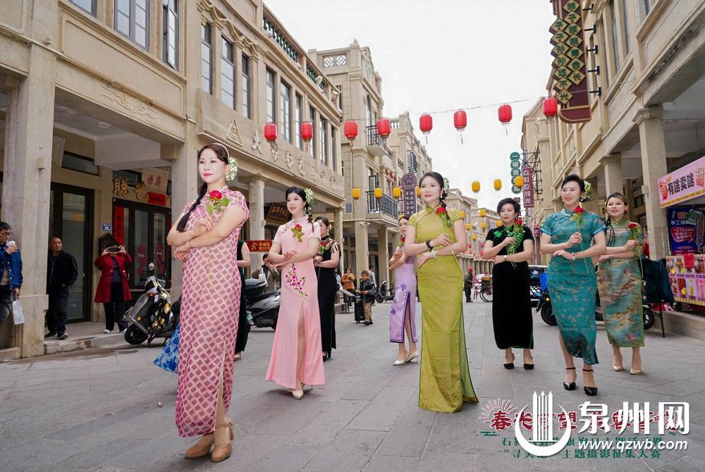 石狮八卦街举办春季旗袍日活动,头戴芙蓉簪、身着旗袍的女子穿梭于骑楼间。 (来源:石狮文旅)