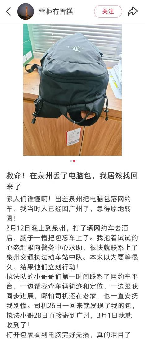 3月10日,远在广州的张先生在小红书平台上发布了一篇长文,专门感谢千里之外的泉州。事情要追溯到今年春节前夕。张先生在泉州搭乘网约车时,不慎将存有公司核心资料的电脑包遗落在车上。彼时年关将至,等他发现时,人已身在广州,而搭载他的网约车司机也返回老家过年。