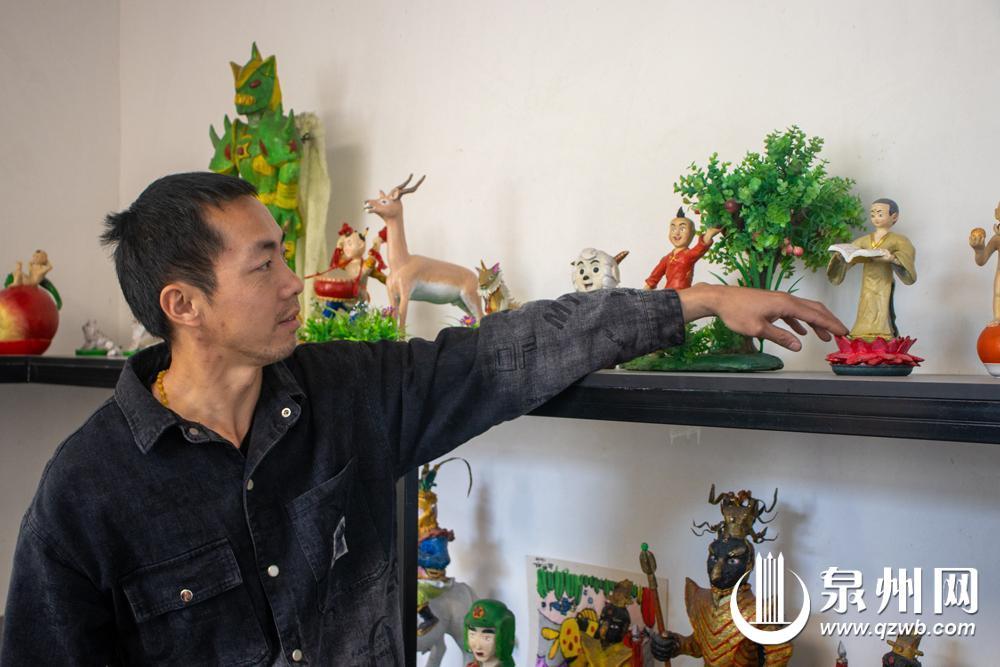 “这是喜羊羊、这是麒麟、这是猫头鹰……”指着自己的作品,吴剑瑜用尽量清晰的闽南语发音为来客介绍。创作时,他有时站着,有时坐着。创作临结束时,他会对作品来回打量,嘴角不自觉地往上扬,眼里藏着欢喜。