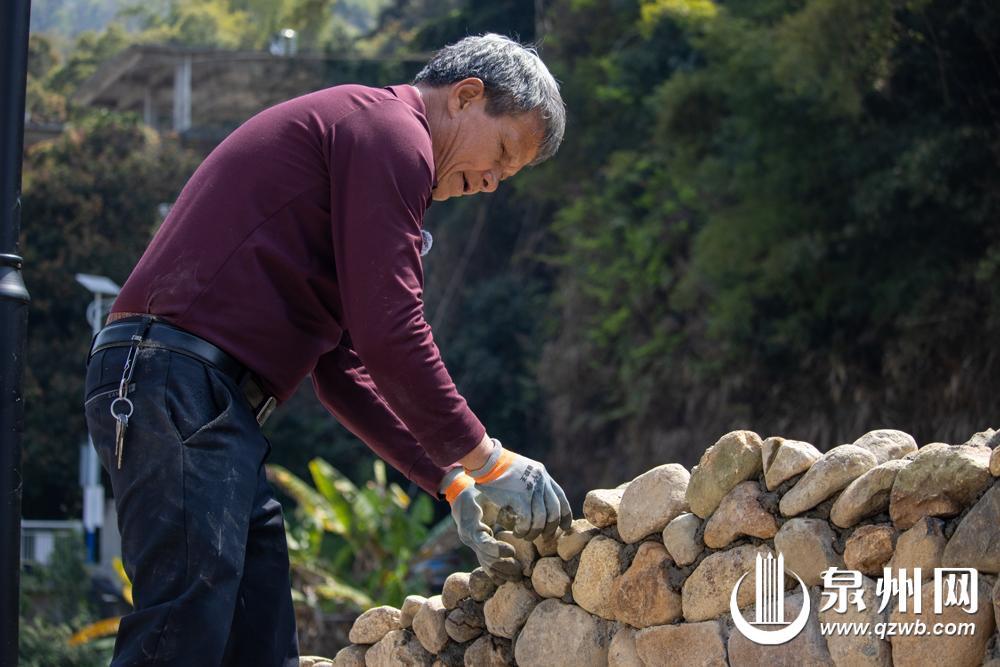长年累月,他的手结了厚厚的老茧,单眼视物也让他对石墙直线的平整度有了更严苛的把控。他做过公路边坡、邻家挡墙。早年,做横平竖直的直墙是他赚钱的硬本事,也是他给自己画下的安全线。
