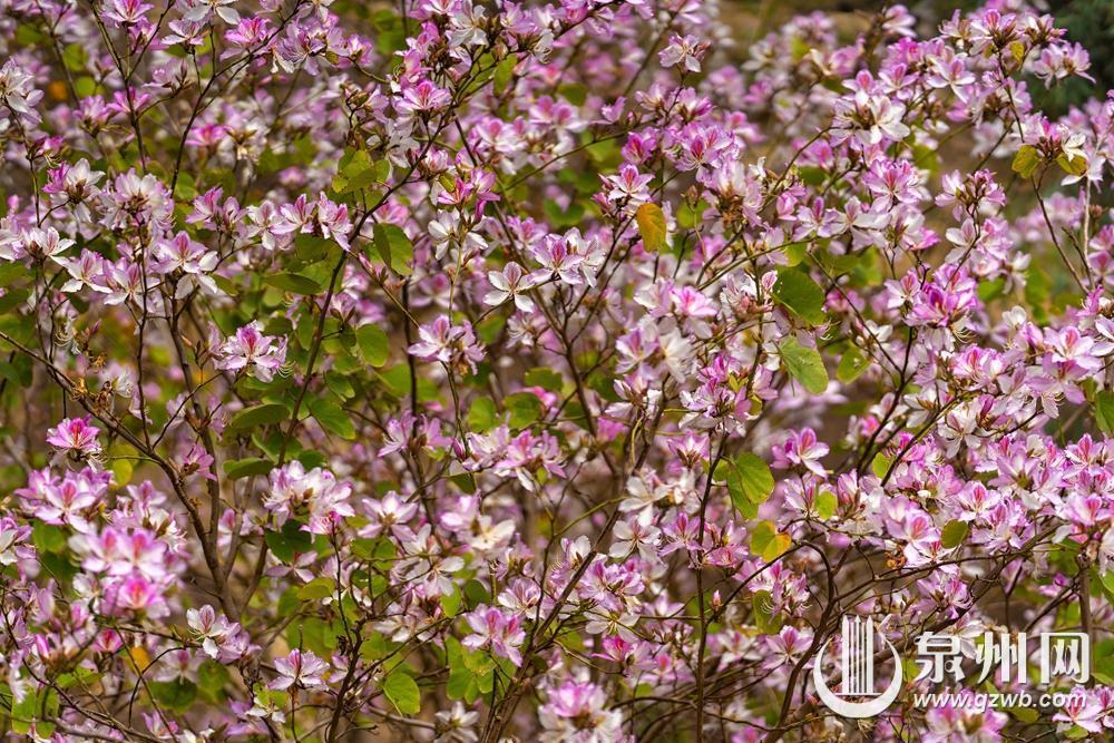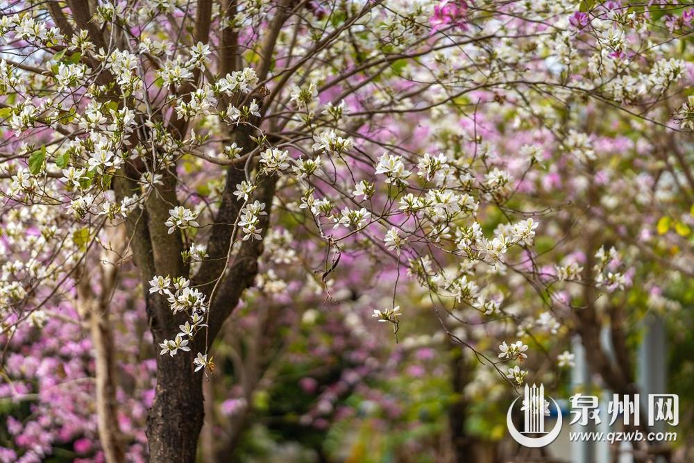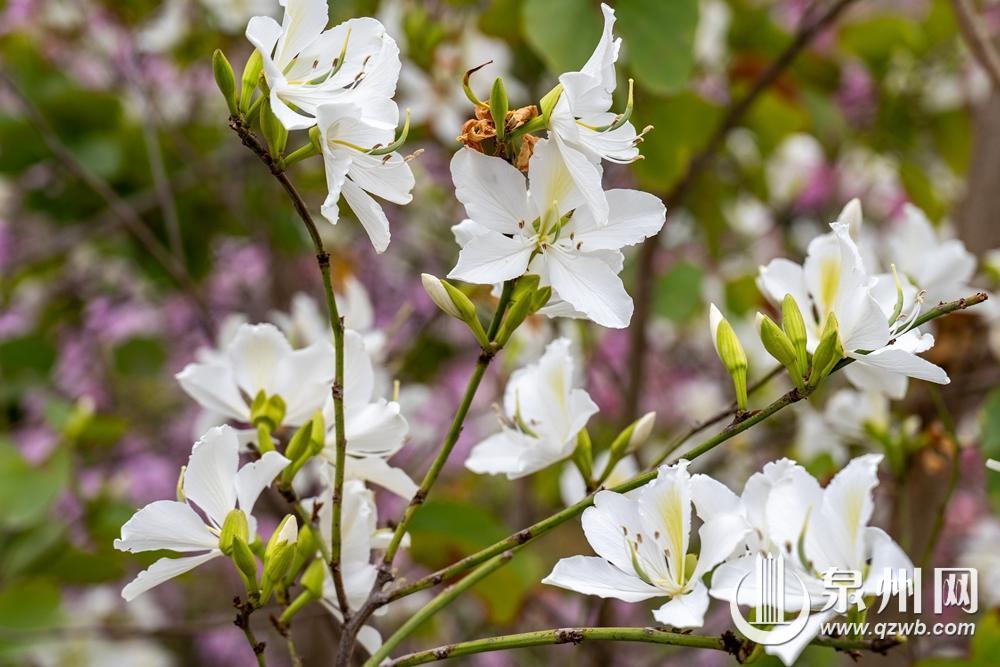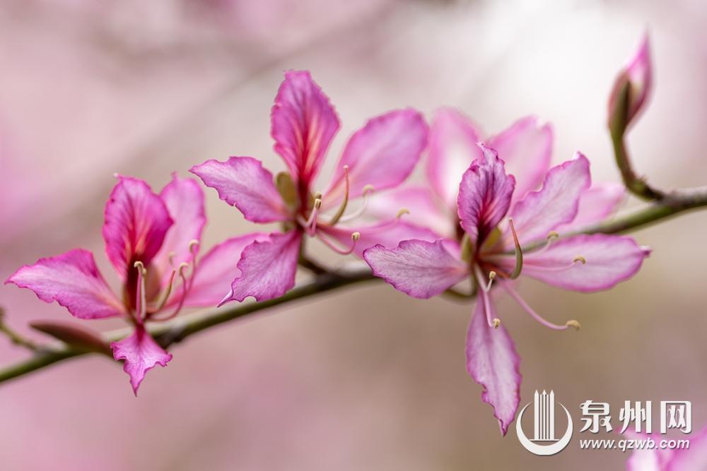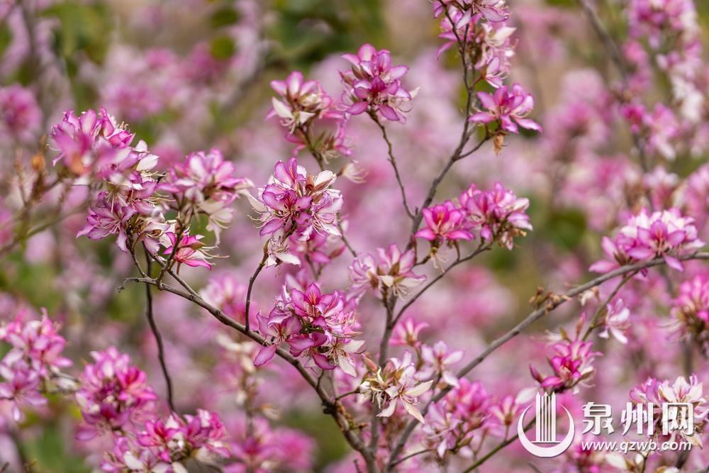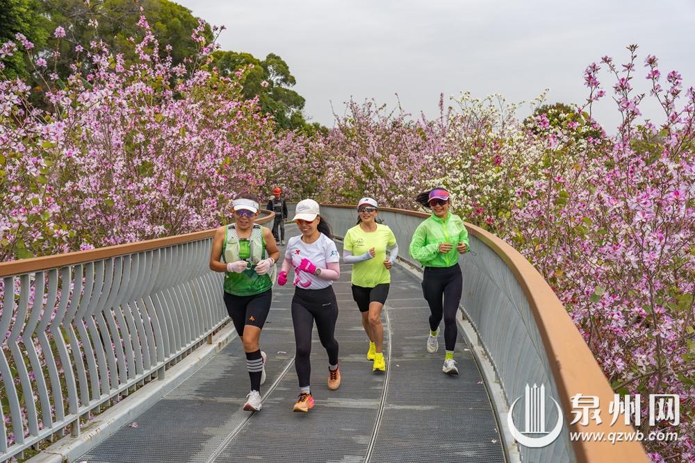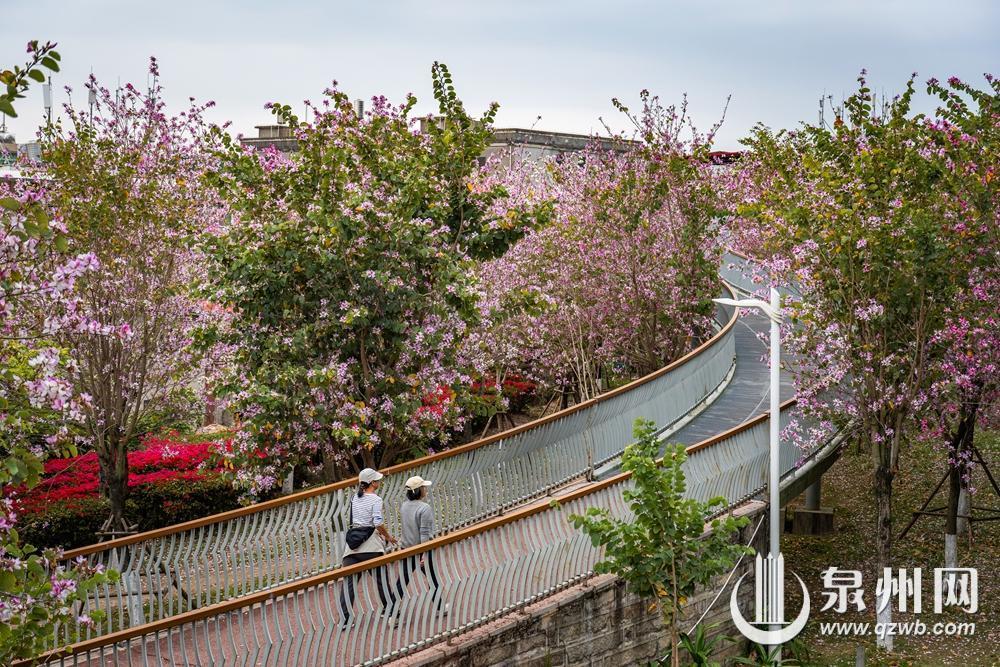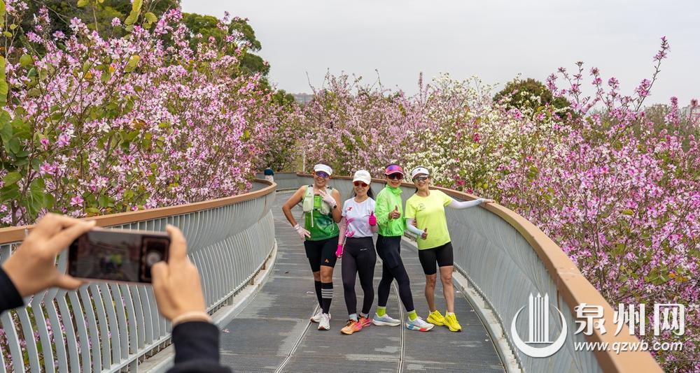 3月26日,泉州大坪山停车楼附近的钢栈道两侧,宫粉紫荆怒放,将栈道装点成浪漫花廊。身着运动装的市民在花海中跑步经过,不禁回头驻足留影,接受春日繁花的热情拥抱。这条城市绿道不仅是市民休闲漫步的好去处,也是春日里的靓丽生态风景线。(融媒体记者陈起拓/摄)