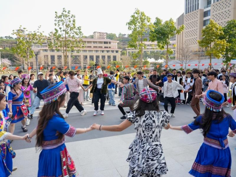 活动在气势恢宏的舞龙舞狮表演与绚丽多彩的少数民族舞蹈中拉开帷幕,瞬间点燃全场热情。两大核心展区 ——“中华石榴园”与“丝路风貌站”同步开放,成为师生打卡的热点。在“中华石榴园”,少数民族的风味小吃、乐器、手工艺品等整齐陈列,有关学子化身“文化使者”,热情讲解家乡习俗,并邀请师生参与“抛绣球”“跳竹竿舞”等互动体验,让大家在欢声笑语中感受中华民族传统文化的魅力。