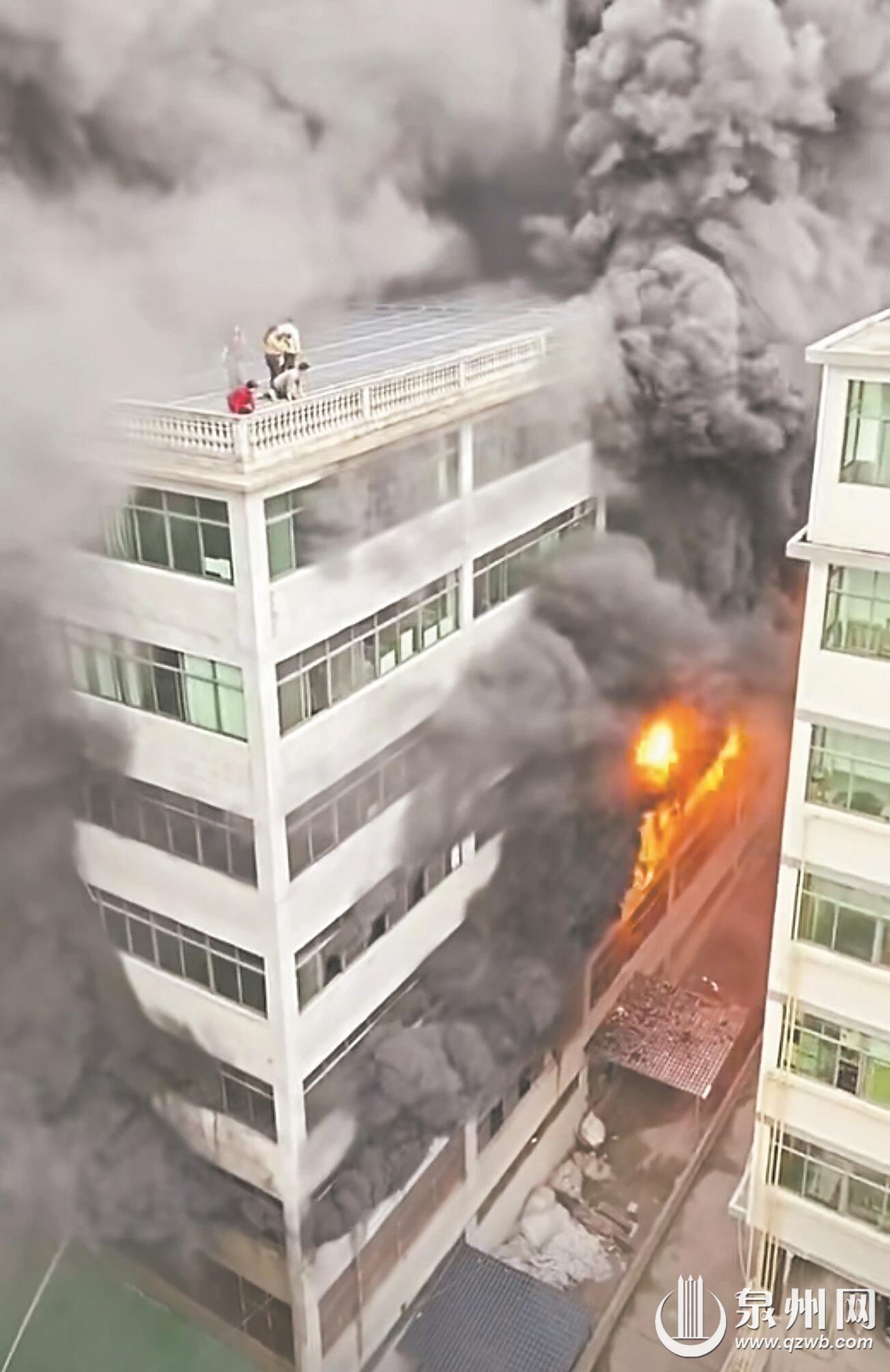 接到报警后,泉州市消防救援支队指挥中心立即调派救援力量赶赴现场,当地应急、公安、卫健等部门快速响应、协同处置。抵达现场后,救援人员发现火势迅猛、烟气浓烈,楼顶被困人员处境危急,随即制定科学处置方案,兵分两路高效施救:一组铺设水带压制火势、阻断蔓延,防止火情扩大;另一组搭建救援通道,冒着浓烟与高温向楼顶攻坚,解救被困人员。