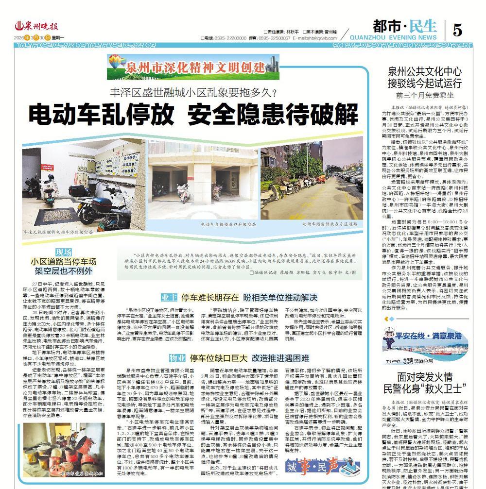 泉州网3月31日讯(融媒体记者 廖培煌 苏珊镕 实习生 张宇轩 文/图)昨日,泉州晚报第五版报道了丰泽区盛世融城小区因电动车停车乱象、架空层杂物堆积等问题,对车辆进出造成影响,也存在一定的安全隐患。相关报道刊发后,物业公司及小区所在的云山社区迅速反应,召开会议着手整改停车乱象等问题,同时逐步推进其他问题整改。