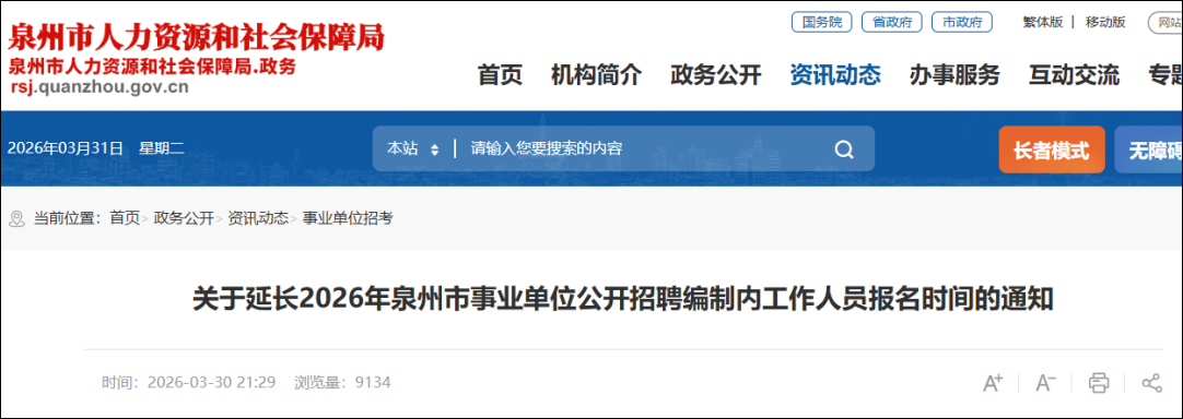 因网络拥堵,经研究决定,2026年泉州市事业单位公开招聘报名时间延长,考生可于2026年3月31日7:00—12:00登录系统报名,资格初审、申诉审核时间延长至2026年3月31日21:00。除上述内容变更外,其他事项不变。请报考者及各招考单位按照有关规定做好相关报名工作。