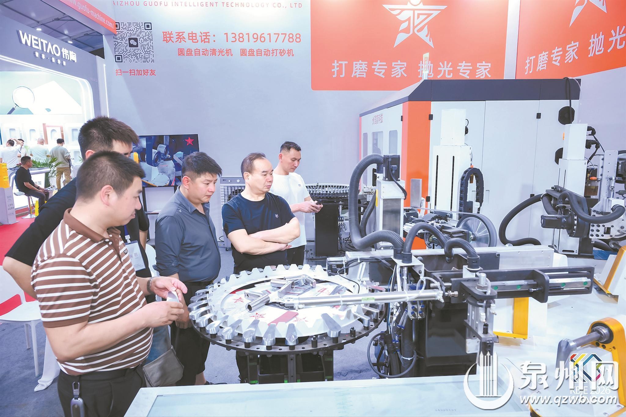 生产端的智能化升级同样引发关注。在台州国富智能科技展区,一台全自动智能抛光机正在现场演示,设备精准打磨着工件表面,展现出智能制造的高效与精准,吸引不少厂商前来洽谈合作。