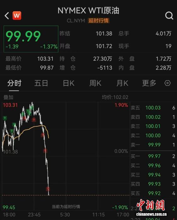 中新网4月1日电(记者 谢艺观)4月1日,国际油价突然跳水,WTI原油失守100美元/桶,布伦特原油一度失守101美元/桶。