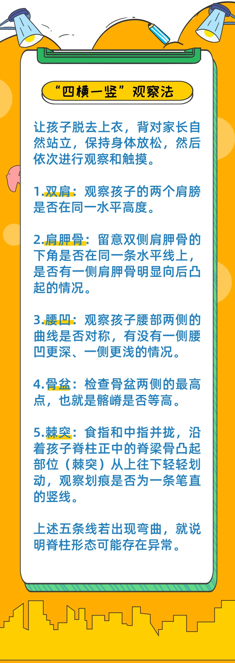 守护孩子的脊柱健康,家庭是第一道“岗哨”。家长掌握简单、有效的自查方法,能第一时间发现孩子脊柱的异常信号。这里教大家一个简单易操作的“四横一竖”观察法,在家就能给孩子做筛查。