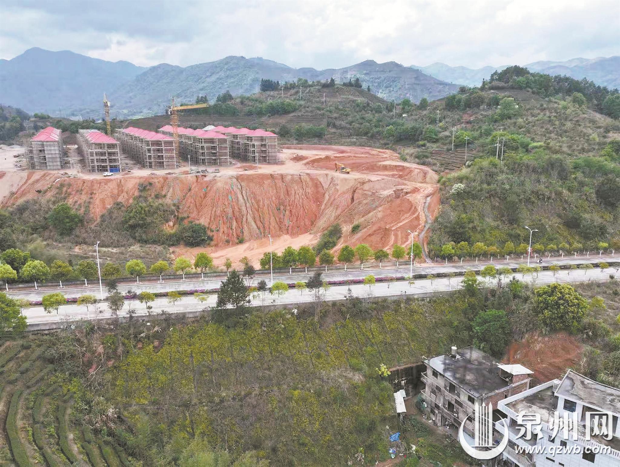 3月30日15时许,记者驱车从感德收费站下高速往镇政府方向前行约1.5公里处,看到道路左侧一处山体被部分推平,数排尚未完工的楼房建在上面。山体侧面形成约30米高的红土边坡,经雨水冲刷,边坡一侧形成缓坡,一侧出现多道沟壑,内部绿色网状覆盖物裸露在外。下方的低洼地带区域被红土掩埋,未被掩埋的区域长满杂草,看不出明显的耕种痕迹。无人机航拍显示,通往该低洼地带的唯一通道为高速公路底下的涵洞,但入口已经被堵住。