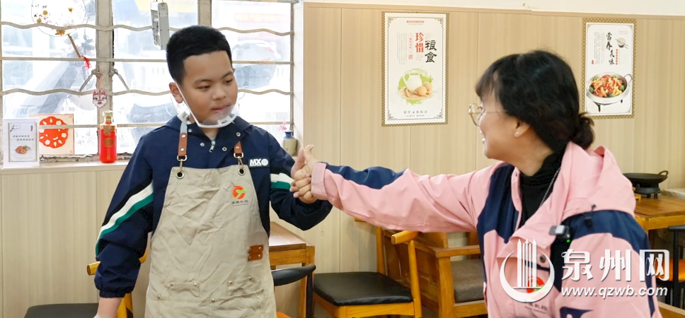 而老师们带着浩轩和小伙伴定期到食堂用餐,闽南老物件的布置、墙壁的书画作品、饭菜的香气和人们的笑容,这些都给孩子们带来了安全感。随后,老师和社区食堂工作人员配合,为他们开展上岗评估和培训。“刚开始擦桌椅容易走神,烦躁情绪一触即发。”吴巧红说,大家一捕捉到情绪,就赶紧安抚,慢慢的,浩轩从刚开始不回应到听指令行动,到擦桌子会发脾气、走神到为顾客端菜,从不定期参与到定期参与,在老师的提醒下学着说 “你好”、“请用餐”,虽然这只是简单的模仿,却是跨越心墙的巨大飞跃。