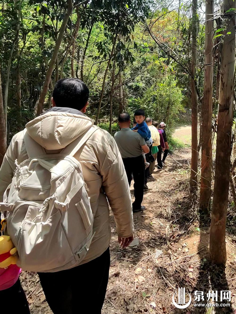 家族20多人排成一队行进在故乡的山间,感受故乡的山山水水和浓浓的乡情乡音。 (高燕妮 供图)