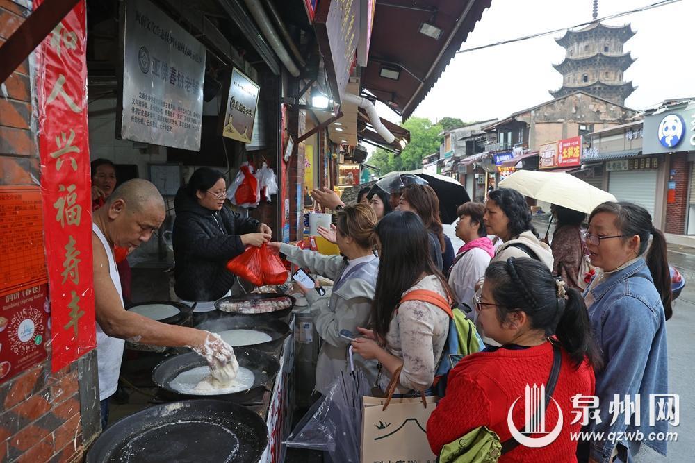 清明已至,润饼飘香。西街一家老字号润饼皮铺子前,市民冒雨争购润饼皮。(柏峰/摄)