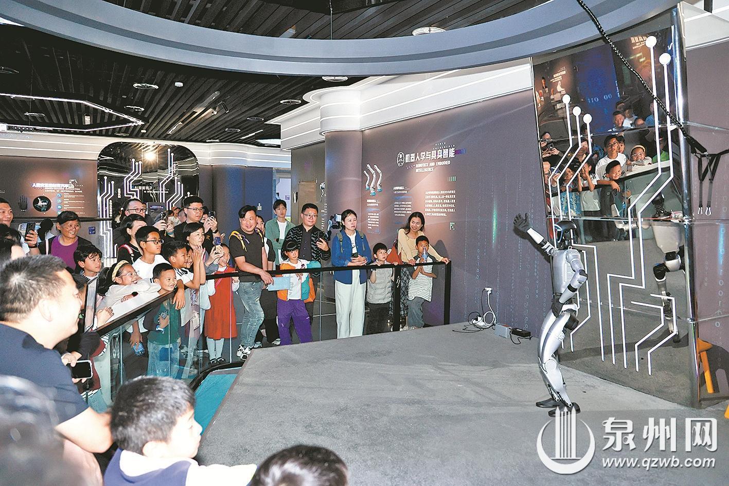 昨日上午,天气晴好,不少市民趁着假期带着孩子到泉州市科技馆参观。图为机器人表演吸引大家围观。 (石树停 摄)