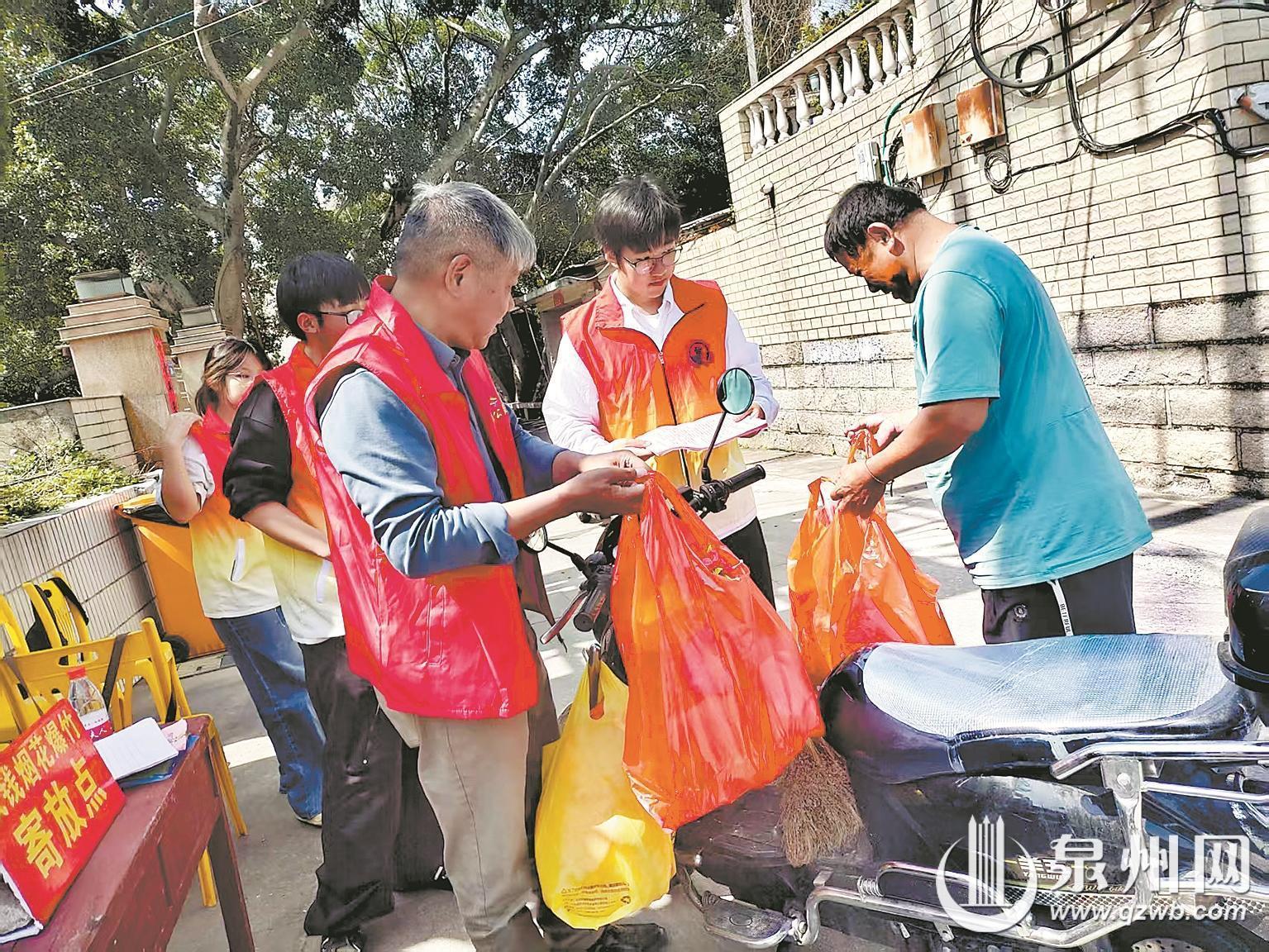 4月5日,在丰泽区北峰街道群山社区组织的清明节“守护青山、文明祭扫”活动中,丰泽作协·老太嬷·梦彩公益、群山社区党员志愿服务队及泉州信息学院部分志愿者在群山社区玉篬路卡点协助社区工作人员,为上山祭扫的群众发放防火宣传手册,提供烟花爆竹等易燃物品存放保管服务,让群众无忧上山祭扫。(融媒体记者苏珊镕 通讯员陈向阳 梁丹萍 文/图)