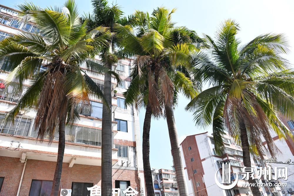 泉州鲤城东街与南俊路北拓交叉路口的花圃中,纬度最高的三棵椰子树吸引不少游客前来打卡。(胡月红 摄)