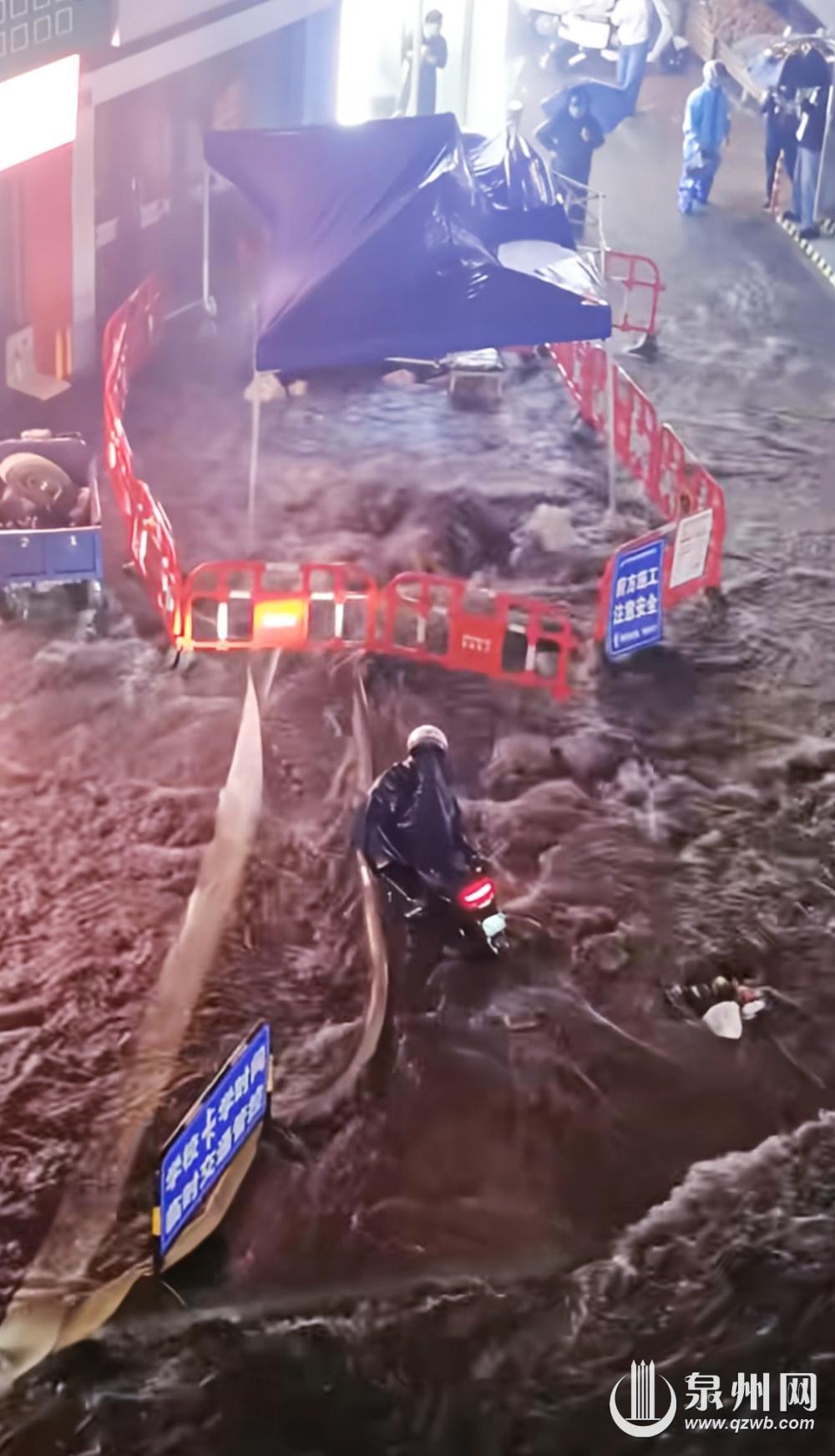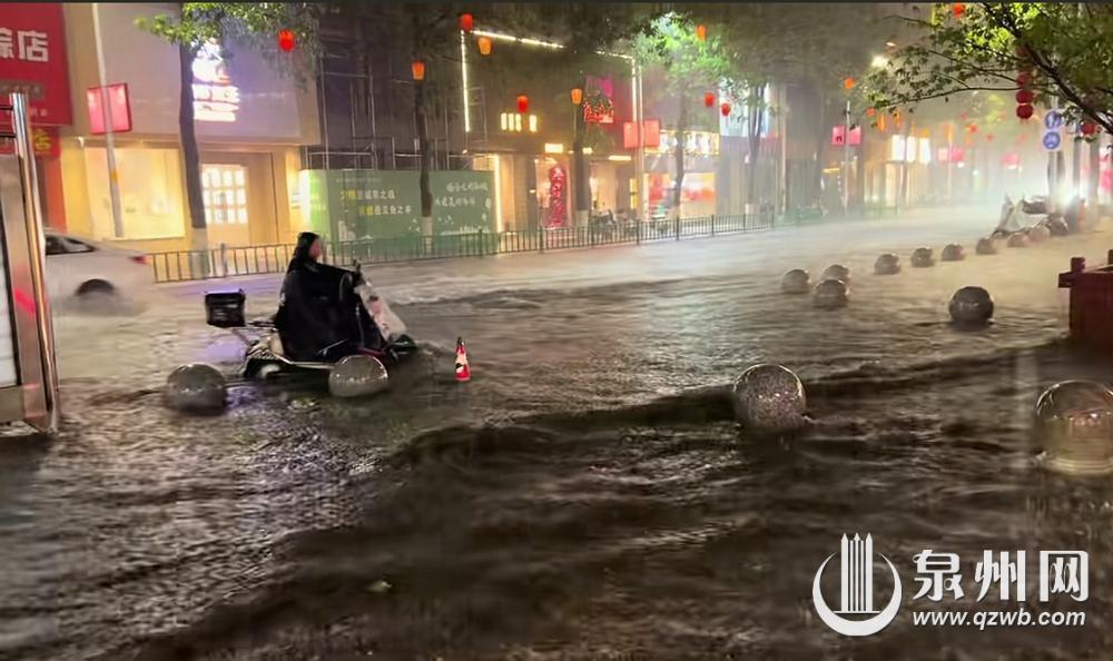 从网友实拍与现场情况来看,泉州市区多个核心路段积水情况尤为突出。鲤城区作为老城区,排水压力较大,西街、中山路周边街巷路面被雨水覆盖,积水最深处已经快到膝盖,往来市民只能小心翼翼蹚水前行。南俊北路、二郎巷等路段,短时积水深度直达小腿,行人通行困难;九一街、打锡街等路段,雨水汇聚成流,车辆行驶时溅起巨大水花。丰泽区的宝洲街、温秀街、通港街、湖美酒店路段积水严重,部分路段积水没过半个车轮。